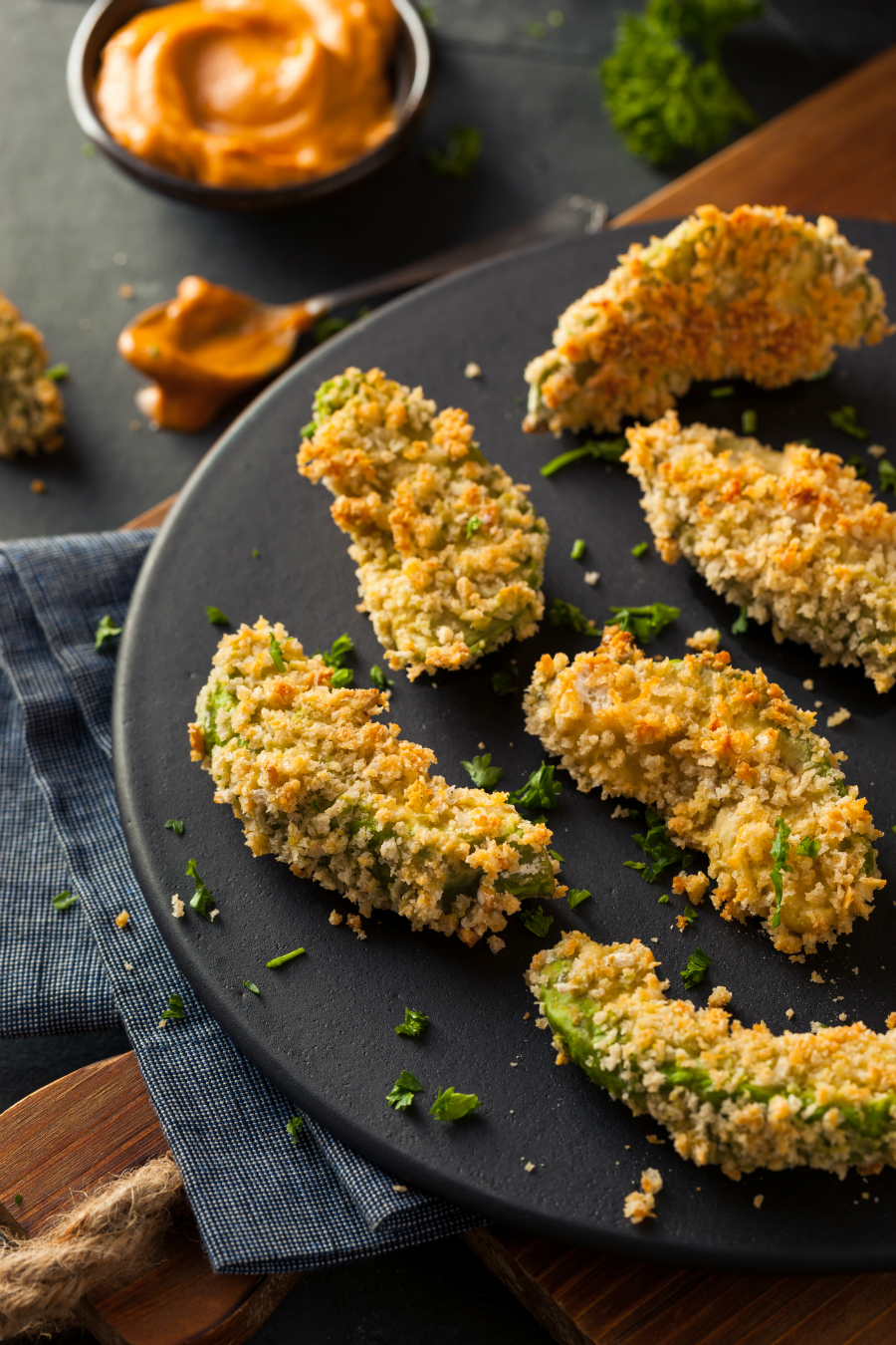 Bekleed een bakplaat met bakpapier. Leg hierop de avocado frietjes en bak 10 tot 15 minuutjes in de oven, tot ze mooi goudbruin zijn aan de buitenkant. Serveer met een pittige dip, bijvoorbeeld een mengsel van zure room en Sriracha.