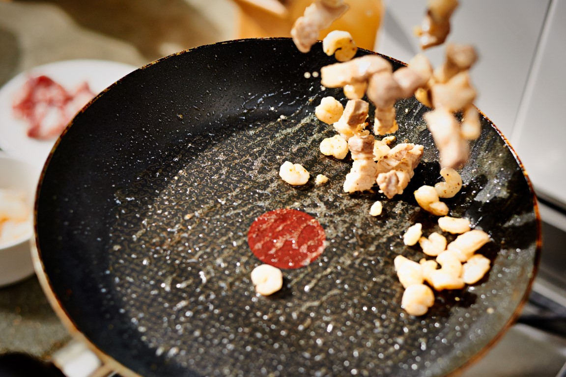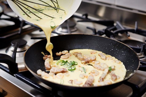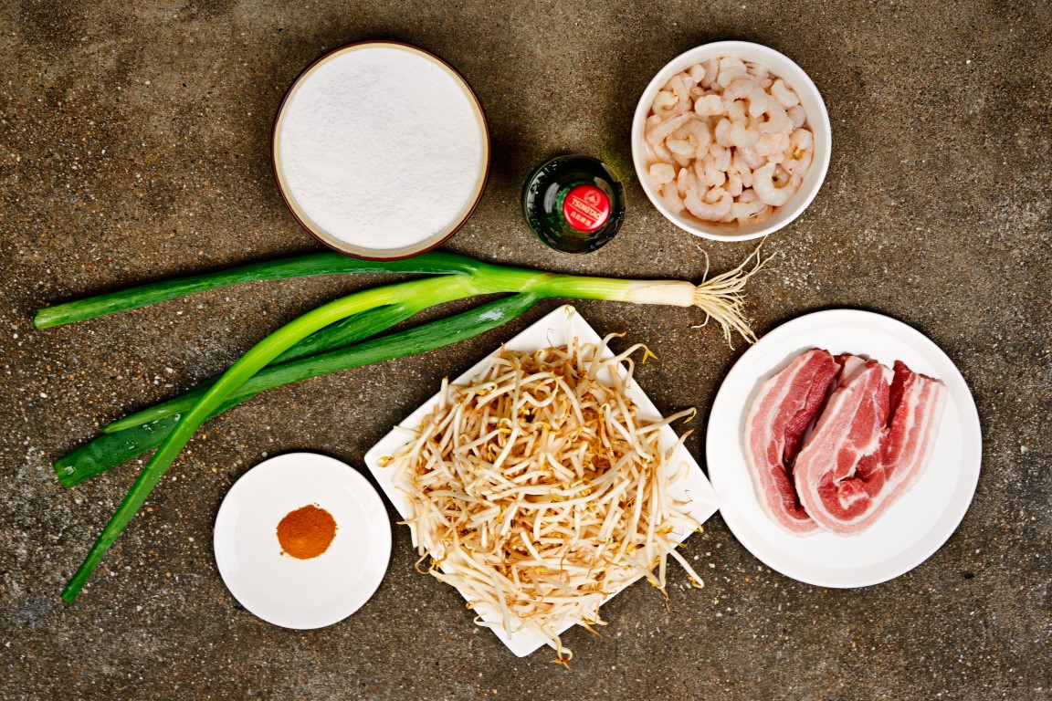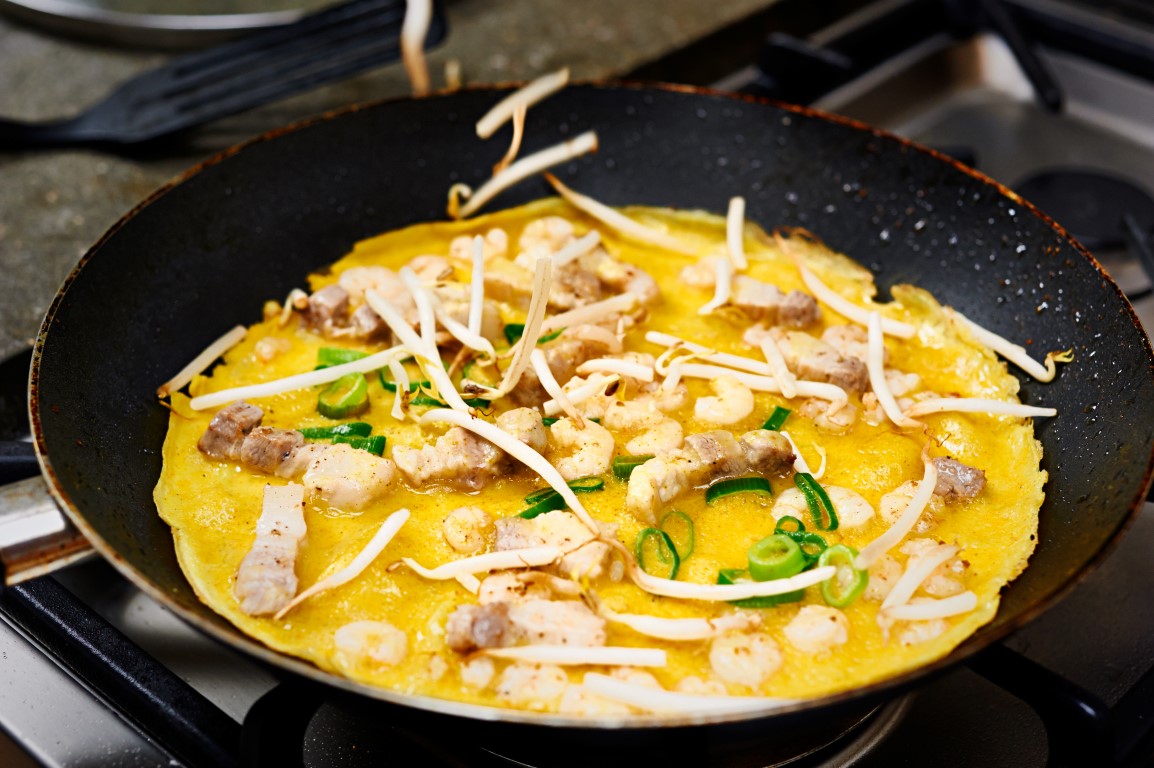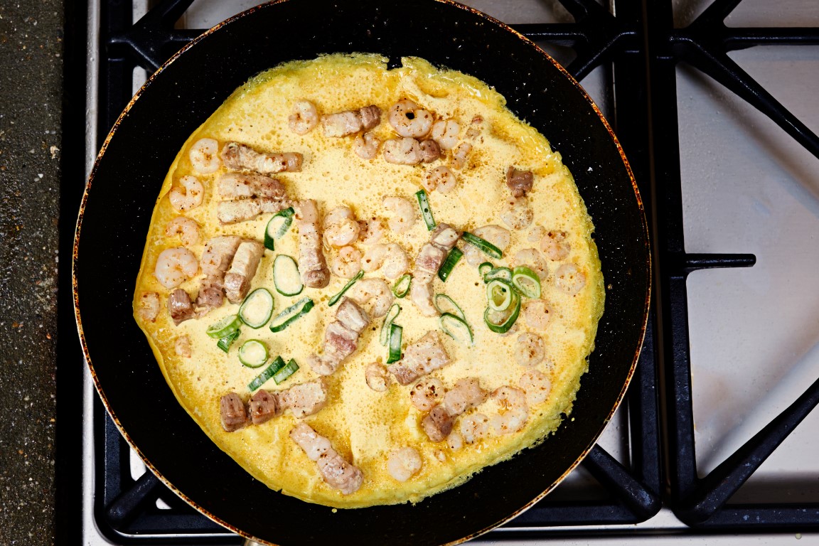 4. Verhit een scheutje zonnebloemolie in een koekenpan en leg er een paar stukjes spek en garnaal in. Bak 1 minuutje aan. Giet voorzichtig wat beslag over de bodem heen zodat je een dun laagje beslag over de hele bodem hebt liggen. Zet het vuur niet te hoog! Dek af met een grote deksel en laat rustig bakken voor 1 minuut (of tot mooi geel kleurtje).