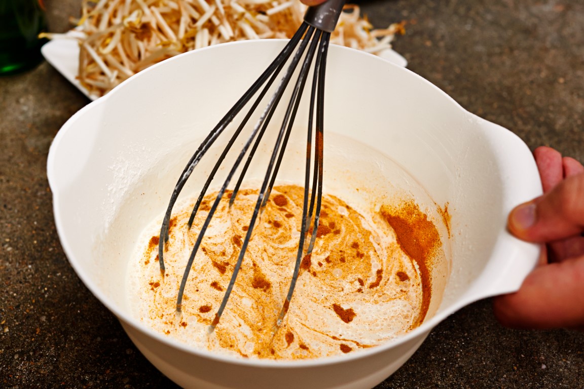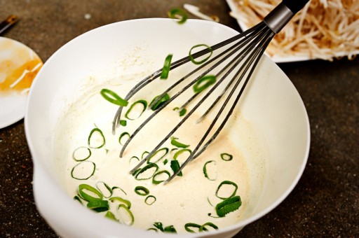 1. Mix de rijstbloem en de kurkuma met een garde en voeg geleidelijk het water toe. Vervolgens roer je het bier erdoor en als laatste de gesneden bosui. Laat het beslag een half uurtje rusten.