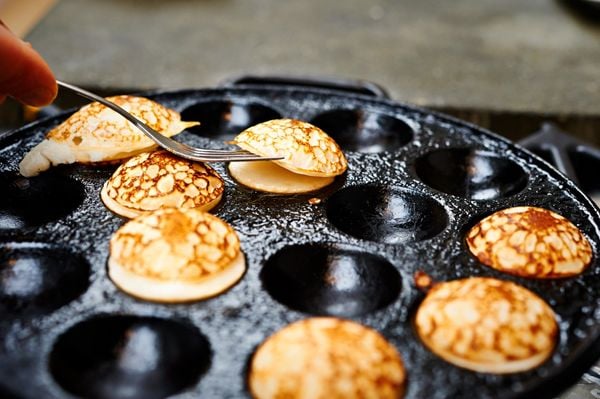 Let op: Voordat het deeg helemaal gaar is, leg je een poffertje gedraaid op een ander stukje. Als het deeg al gaar is, zullen ze niet goed aan elkaar plakken. Op die manier krijg je dus een soort balletje. Smakelijk! (Bakje vouwen van bananenblad? Check dan deze video).