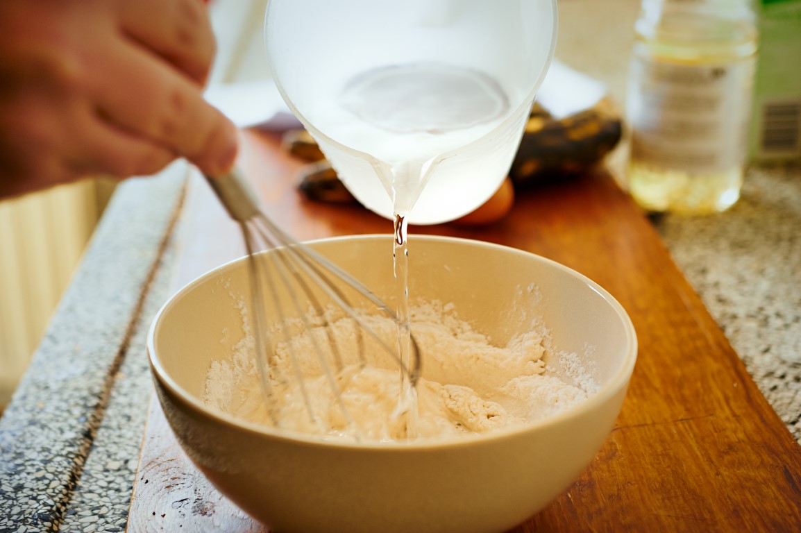 - Doe de bloem, het zout en bakpoeder in een kom. Voeg langzaam het water toe en roer goed met een garde tot je een pannenkoekachtig beslag krijgt. Voeg het ei toe en roer nog even goed door.