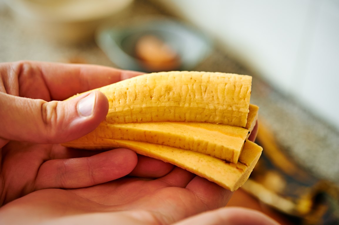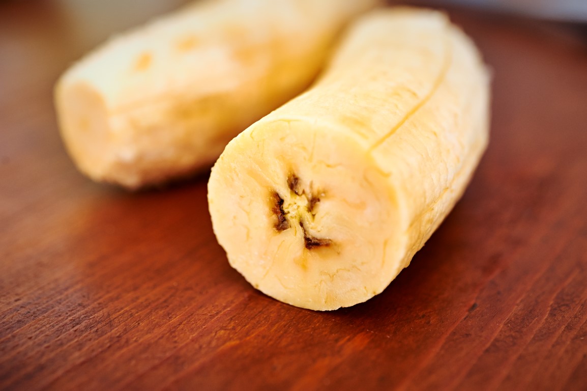 - Verwijder de schil van de banaan. Halveer de bananen.