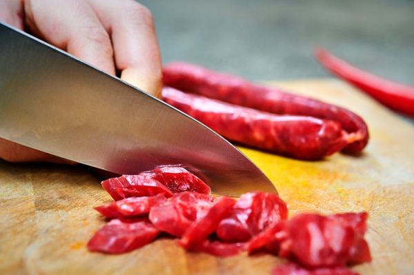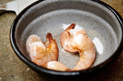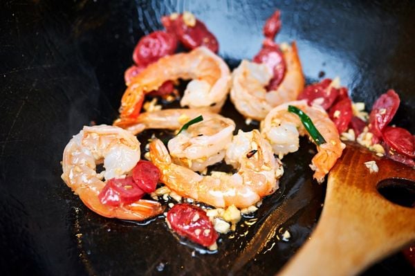 7. Scheutje zonnebloemolie olie in de wok. (Traditioneel wordt dit gerecht in reuzel bereid. Dat kan dus ook.) Voeg de knoflook, Chinese worst en garnalen toe. Bak 1 minuut al roerend.