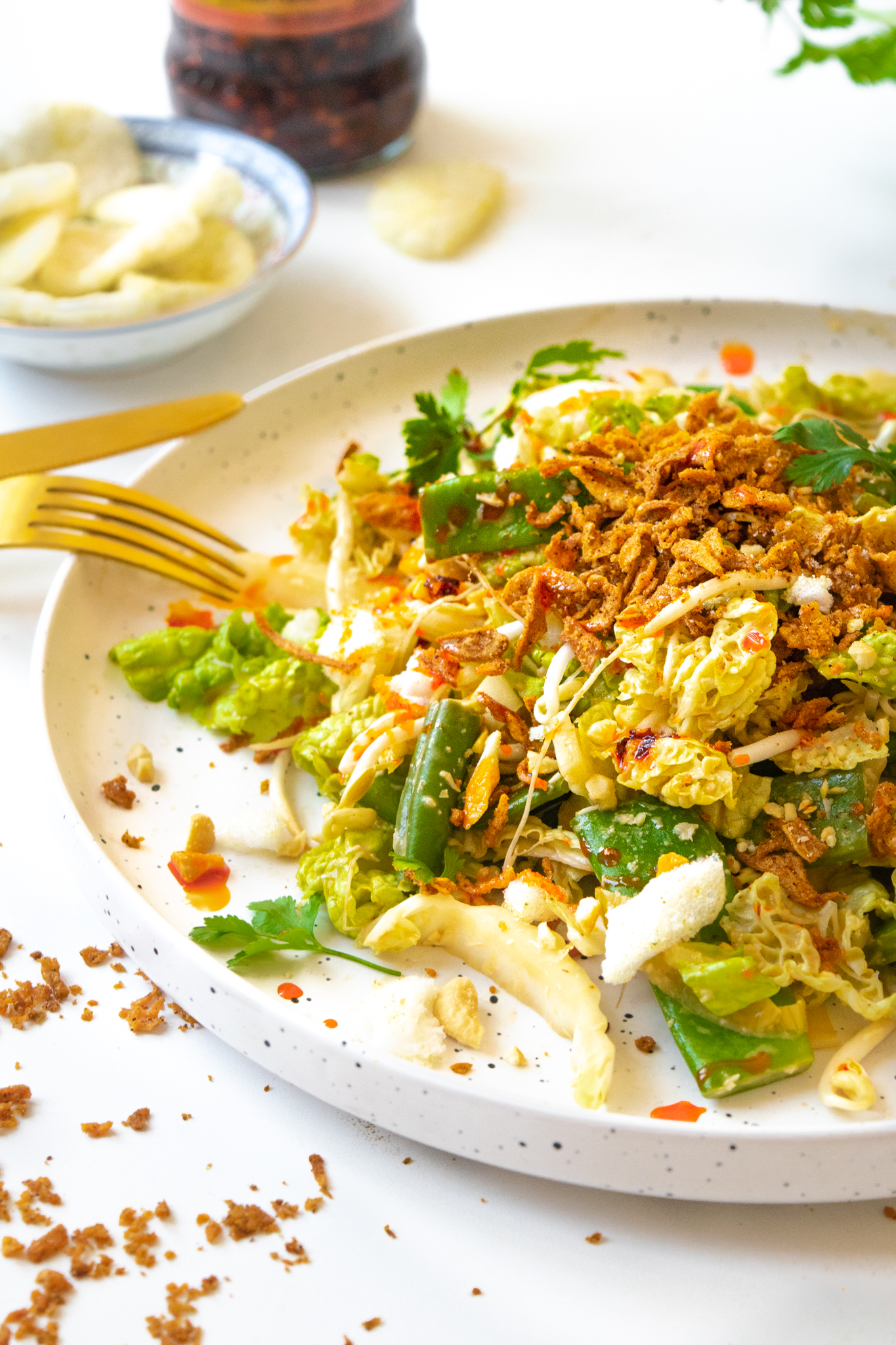 Wie van spicy houdt, gaat deze salade nóg lekkerder vinden met wat extra Aziatische chili-olie eroverheen gedruppeld. Onze favo is de Chicken flavour chilli oil with tofu van het merk Laoganma, die je bij de toko vindt.