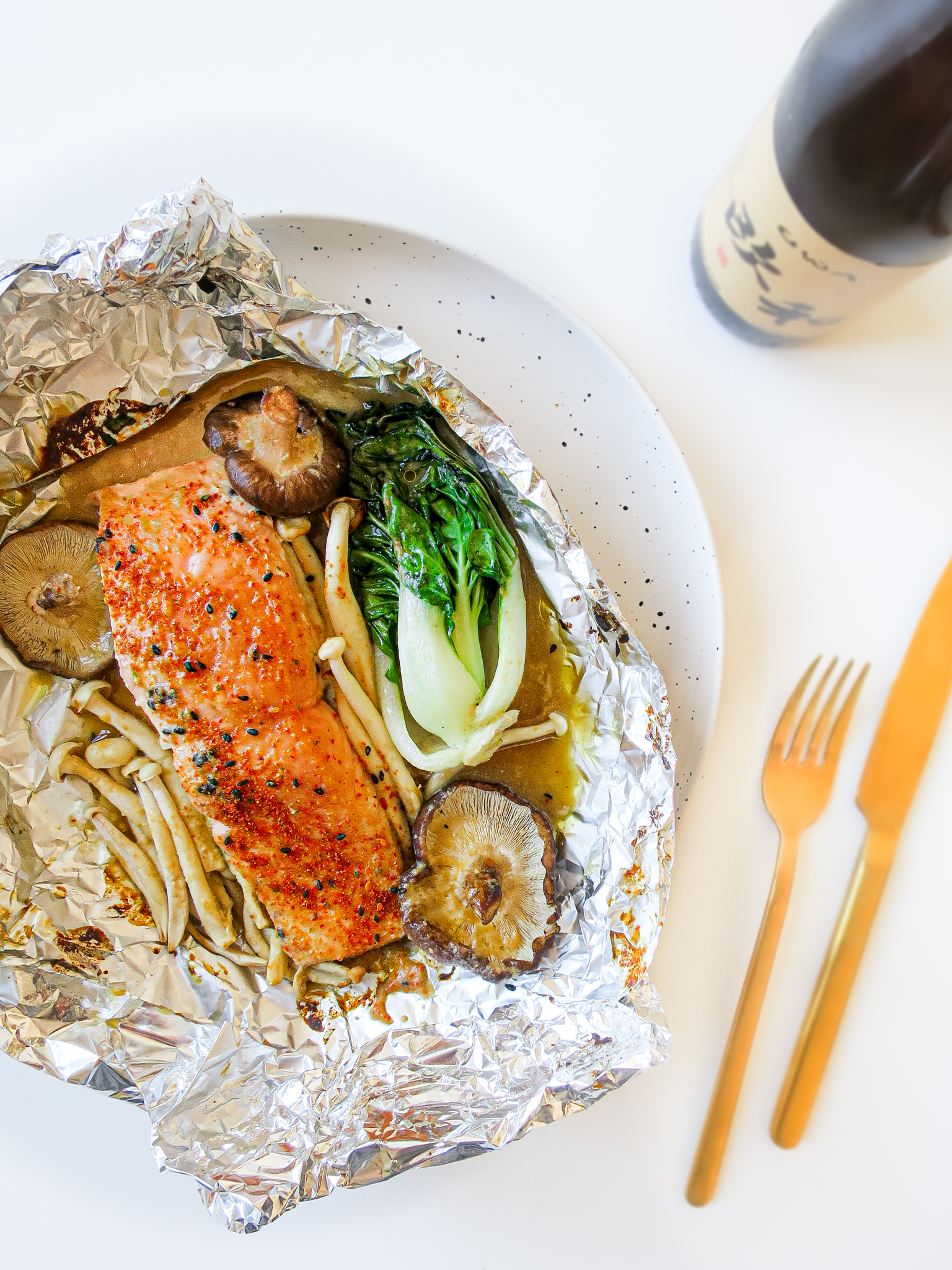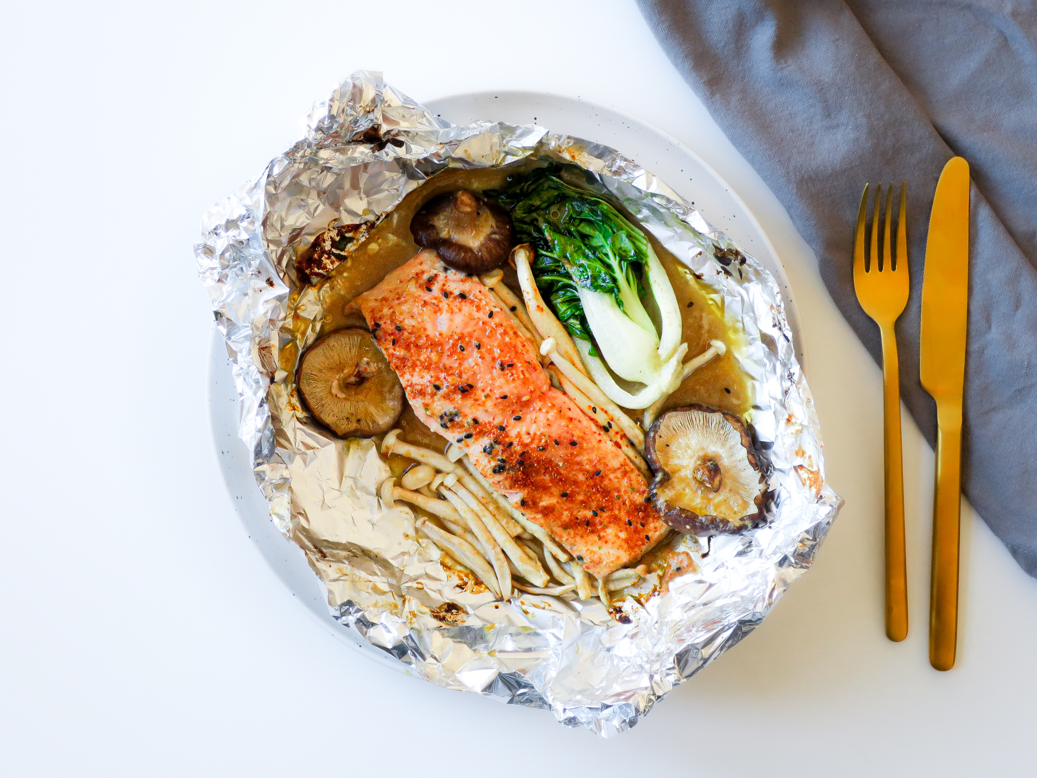 Het leek ons gigantisch lekker om een foil yaki versie te maken met zalm, baby paksoi en een paddenstoelenmix. Wat dat laatste betreft kozen wij voor enoki (die héle kleine) en shiitake maar voel je vooral vrij om je favoriete paddenstoelen te kiezen, naar het aanbod van het seizoen.