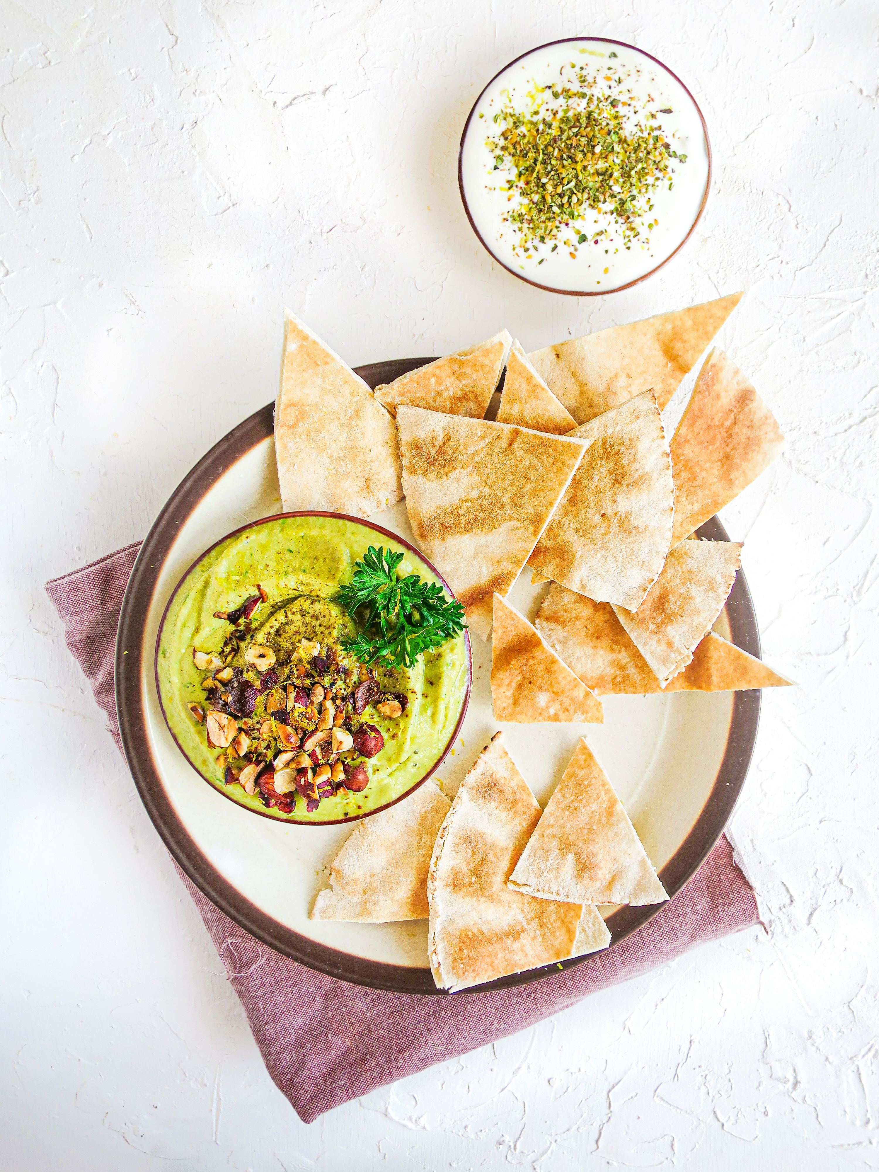 Maak een apart schaaltje met geitenyoghurt, za’atar en citroenrasp en serveer met de stukjes flatbread. Dippen maar!