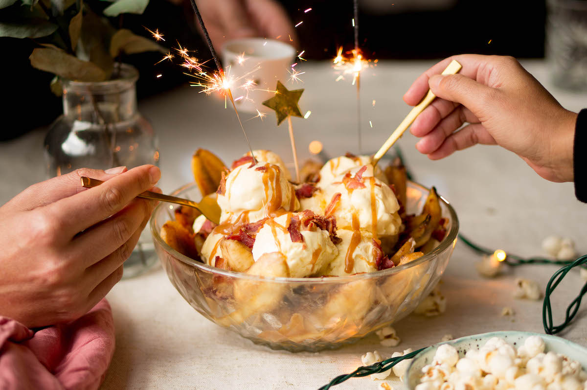 Let’s split a bananasplit: check die maar eens op Youtube. Onder het genot van deze mega bananensplit uiteraard. Naar ons idee het ultieme kerst dessert om te maken met de feestdagen! Deze mega bananensplit is voor de hele familie en bevat het romigste vanille-ijs van Hertog, gekarameliseerde bananen, pindakaas-saus en knapperige bacon (geïnspireerd op de beroemde favoriete sandwich van Elvis). Genoeg om te delen met de hele familie en ook nog ’s in een mum van tijd gemaakt. Dubbel winst!