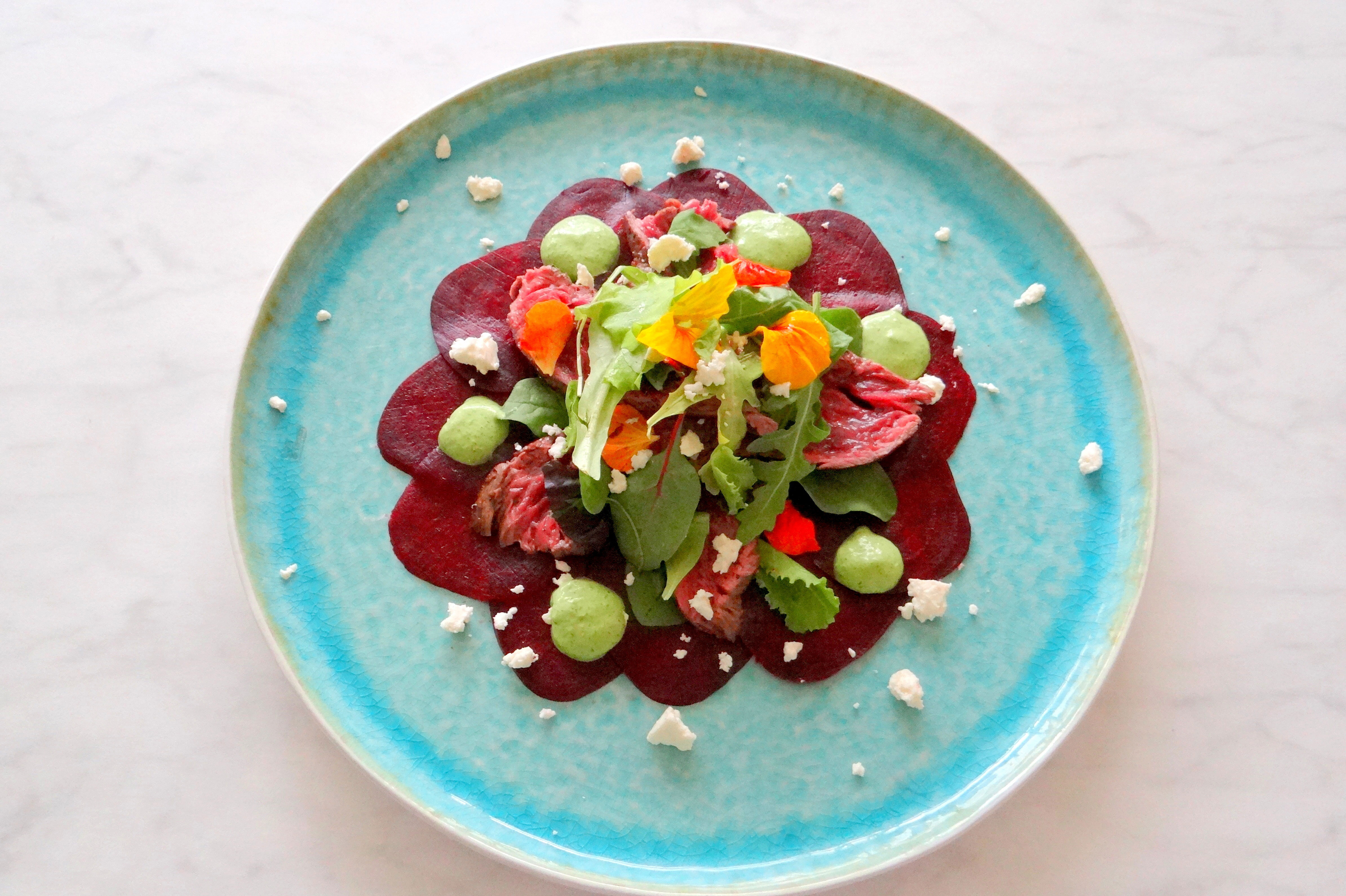 Biet en beef carpaccio met feta en Green Goddess dressing