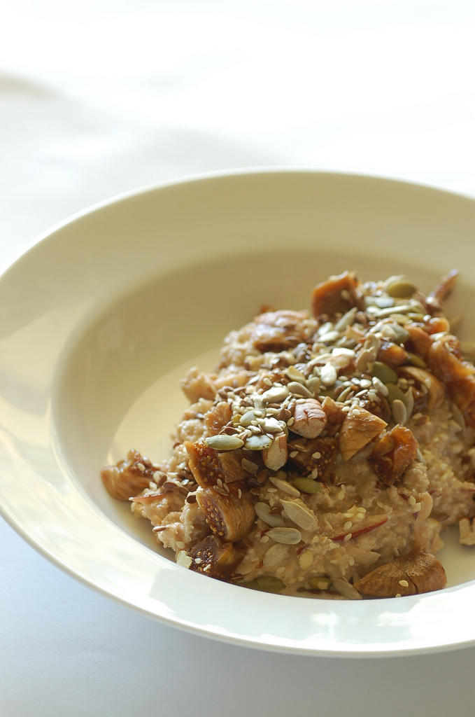 Week de havervlokken de avond van tevoren. Roer de geraspte appel, zaden, pitten en noten met de havervlokken los en serveer met yoghurt en de stukjes vijg.