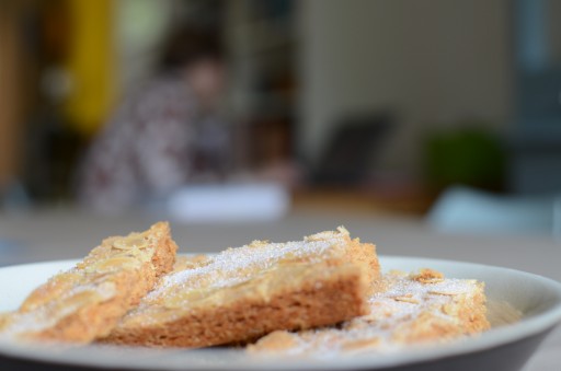 Verwarm de oven voor op 160 graden. Vet een vierkante bakvorm van achttien centimeter in met boter (een grotere vorm kan ook, probeer je dan wel aan de verhoudingen in het recept te houden). Doe alle ingrediënten behalve het amandelschaafsel in een keukenmachine en meng goed. Maak er met je handen een deegbal van en duw het in de vorm. Bestrooi met het amandelschaafsel.