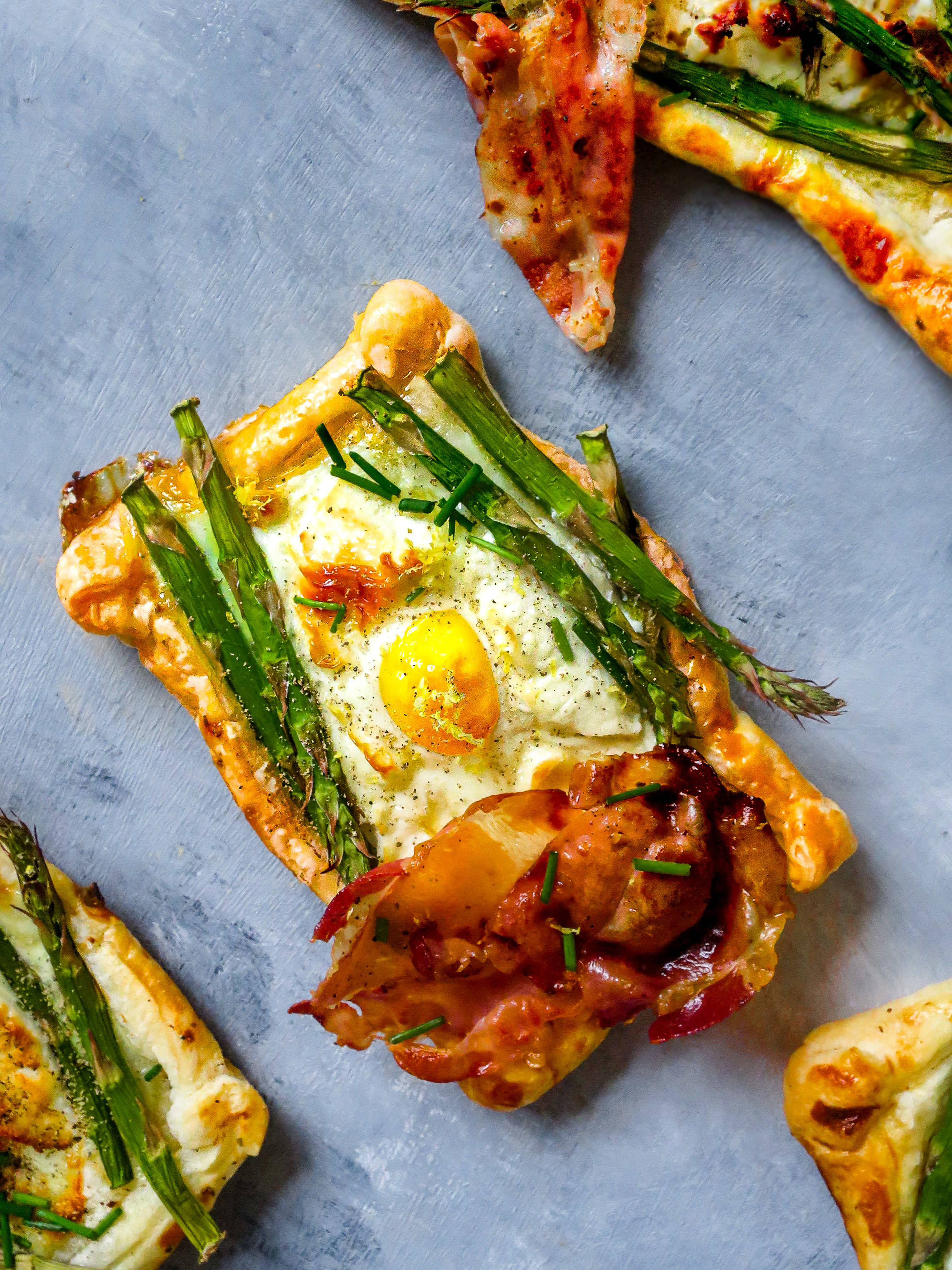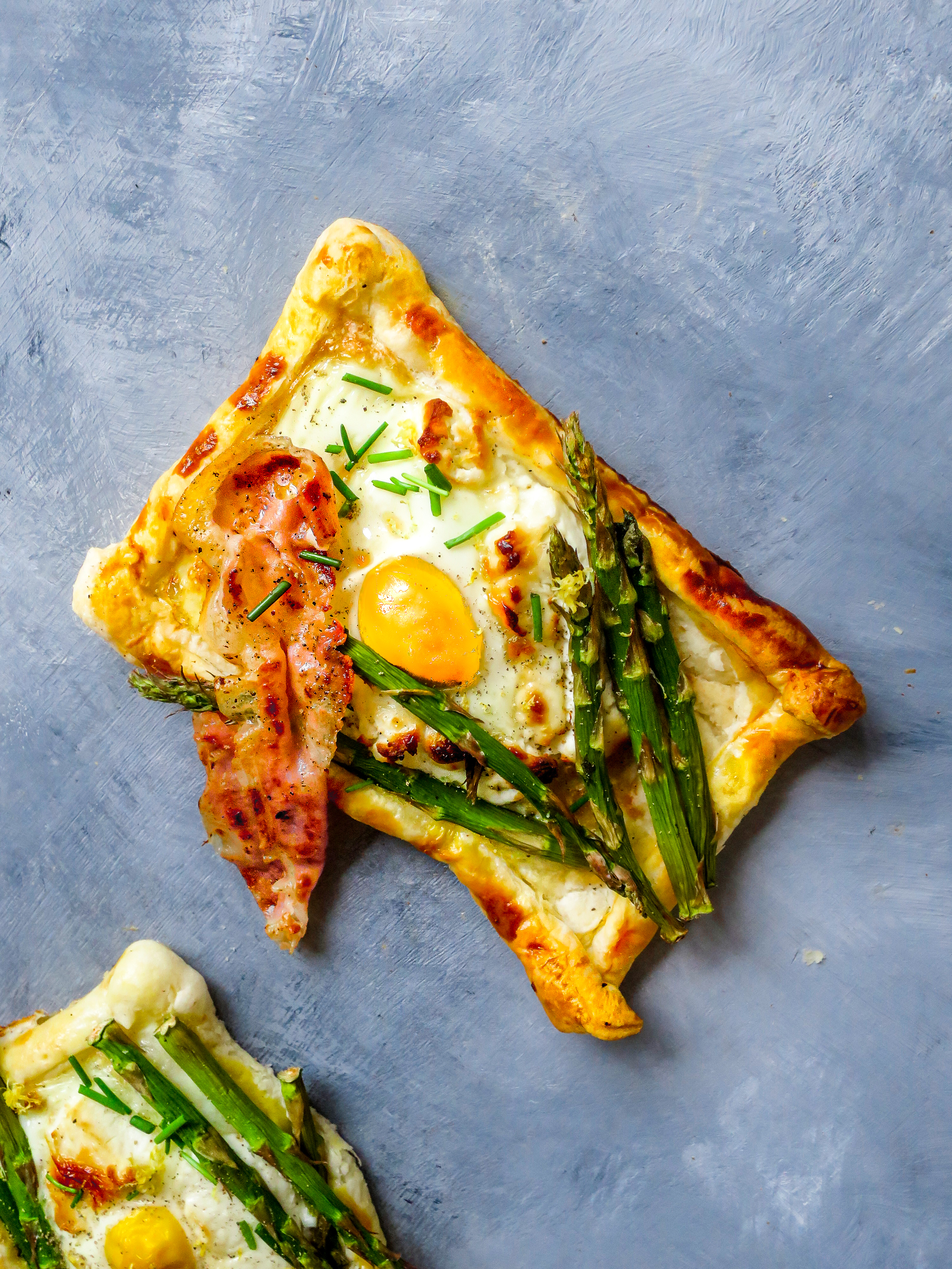 Bladerdeegtaartjes met ei, ham en groene asperges