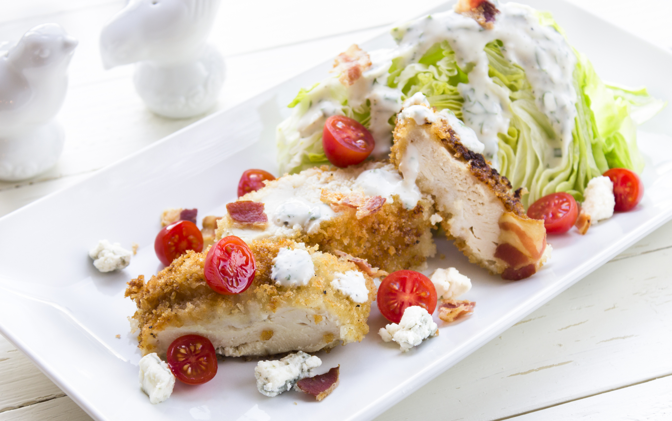 Maak de sla aan met je favoriete dressing. Halveer de cherrytomaten en verdeel deze over de salade. Leg hierop de krokant gebakken kip, de bacon en als je wil nog wat blauwe kaas, bijvoorbeeld Roquefort. Smakelijk!