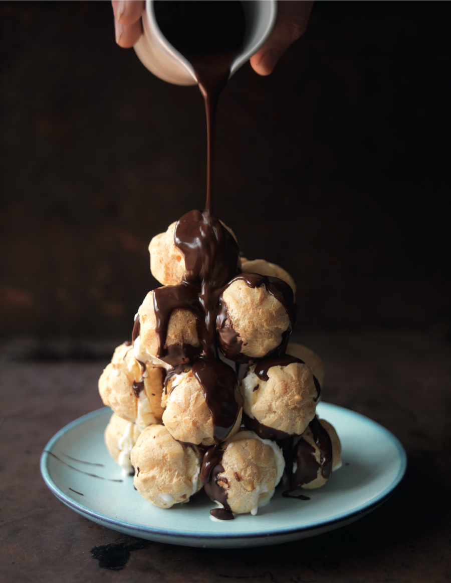 Maak een toren van de soesjes en schenk de warme chocoladesaus erover. Zo serveer je een heel spectaculair dessert.