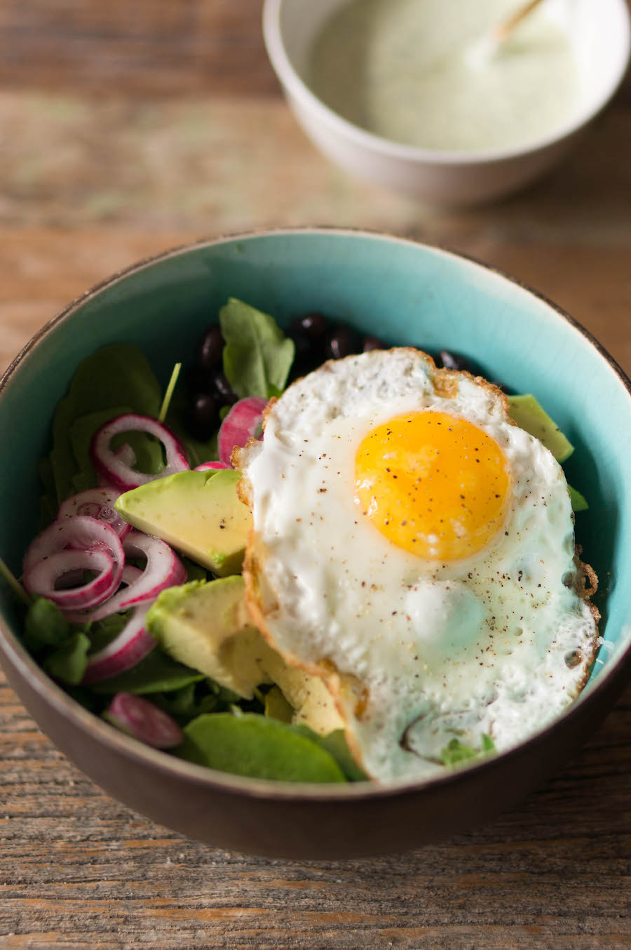 Tijd om de breakfast bowls op te maken! Schep wat van de zwarte bonen in een kom en kruid ze met zout en peper. Leg er wat van de rucola op, de ingemaakte rode ui en de avocado. Maak af met het gebakken eitje en serveer met de dressing.