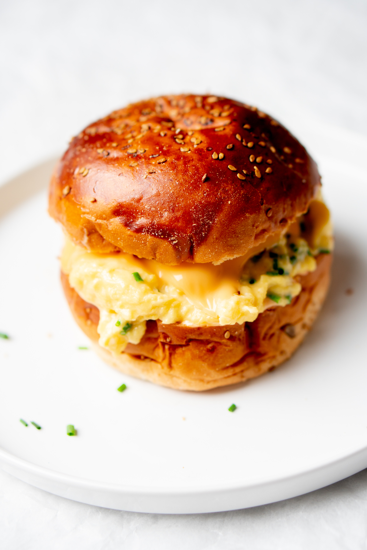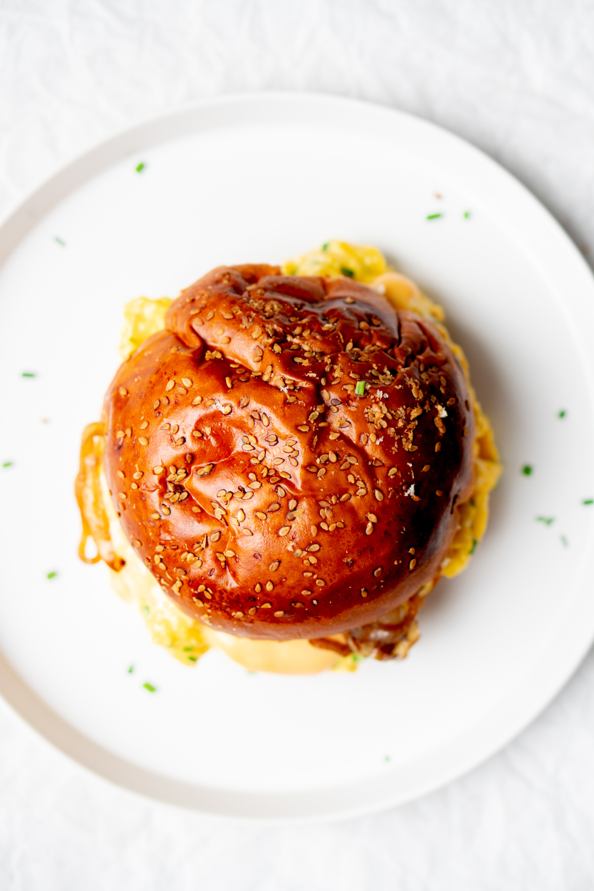 Bij Eggslut noemen ze dit de Fairfax. Het is een brioche met het meest smeuïge roerei dat je ooit hebt geproefd, gesmolten kaas, srirachamayonaise en gekarameliseerde uien. Een caloriebommetje, maar zó goed.