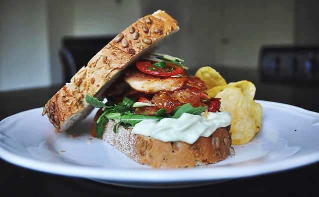 Besmeer de broodjes met de avocadocrème en beleg met de salade, en afwisselende laagjes van kippendij en gekaramelliseerde sjalotjes.