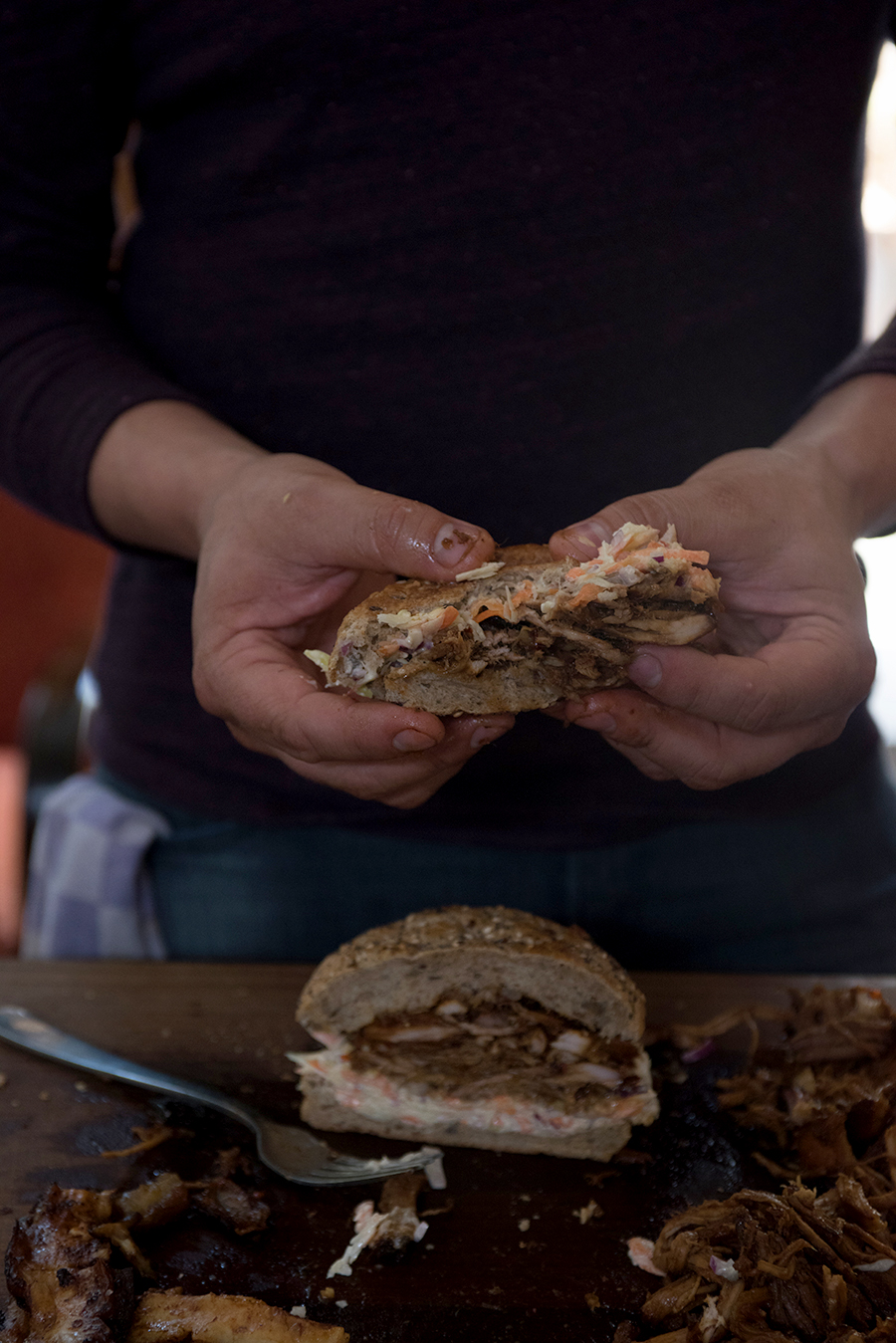 Rooster de broodjes in de oven op 180 graden kort tot ze warm en licht krokant zijn. Snijd de broodjes overlangs in tweeën, lepel er een flinke schep koolsalade op, en een royale portie pulled pork. Druppel er gerust nog een beetje van de jus uit de ovenschaal bij.