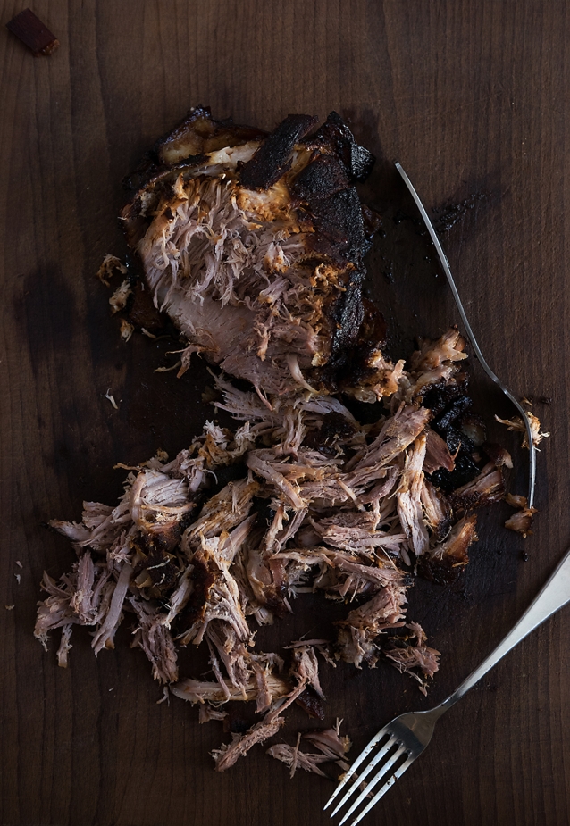 Haal het vlees uit de oven en laat het een beetje afkoelen. Verhoog de oventemperatuur tot 180 graden. Trek (pull, vandaar pulled pork) het botermalse vlees met 2 vorken uit elkaar, in draderige pluksels.