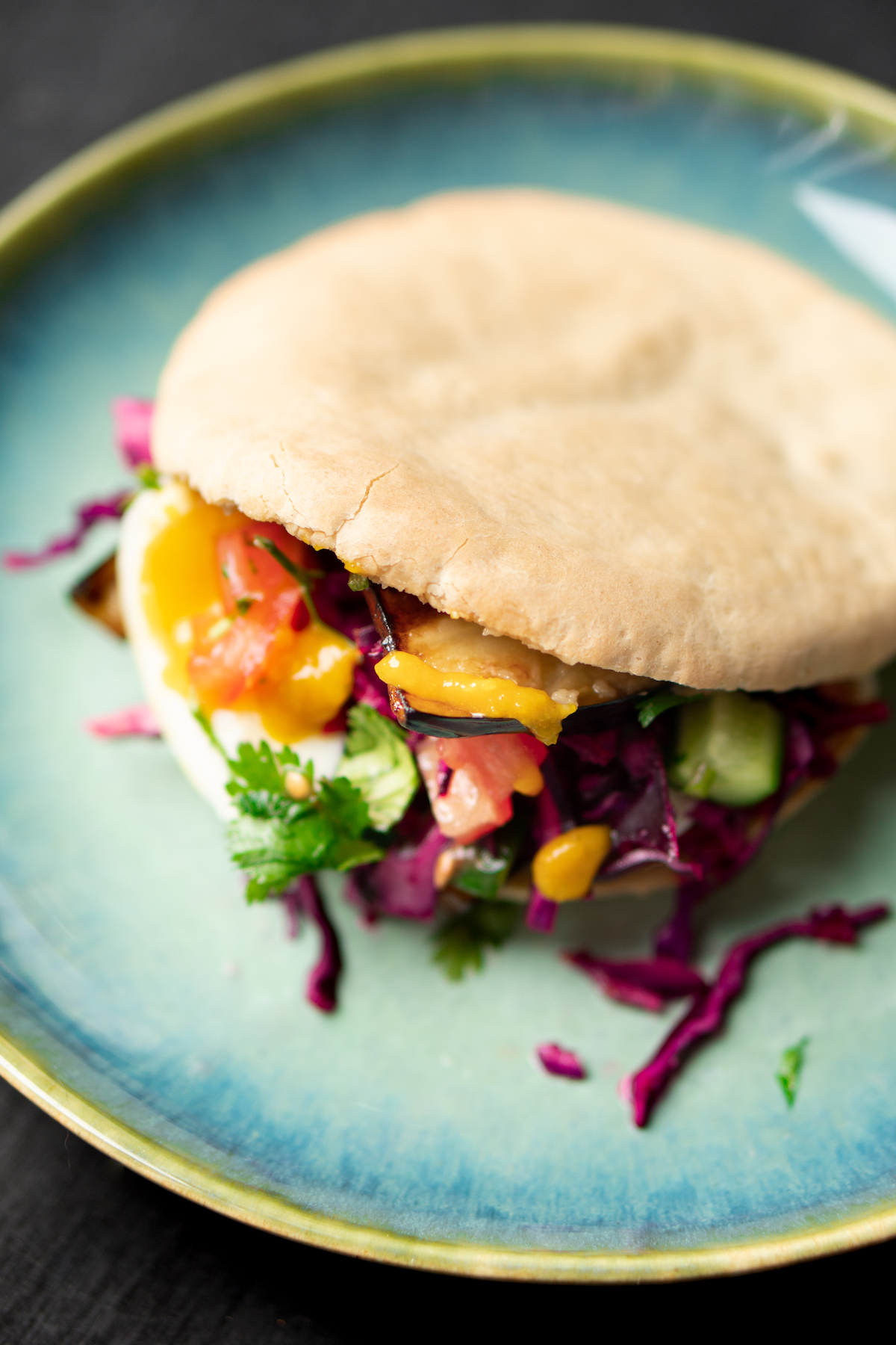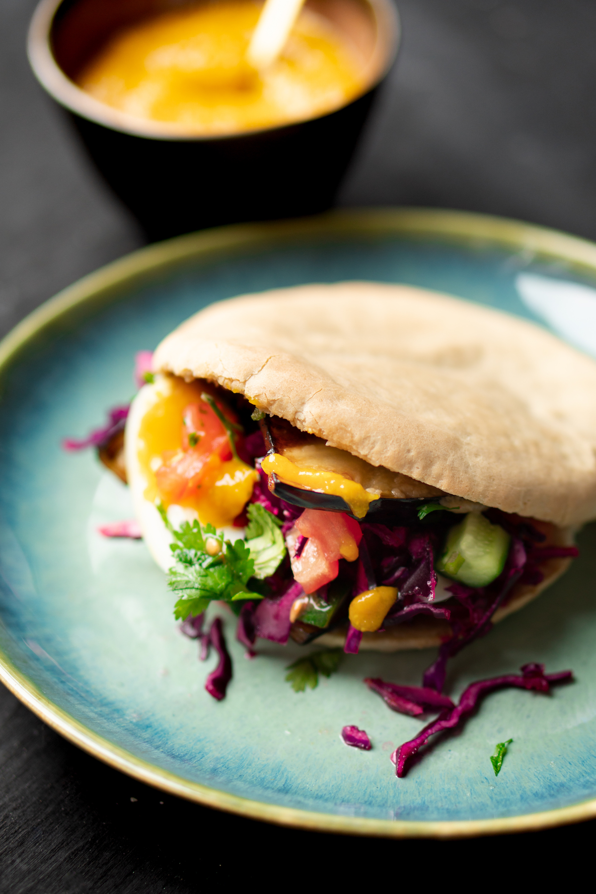 Broodje sabich (met aubergine, ei en pittige mangosaus)