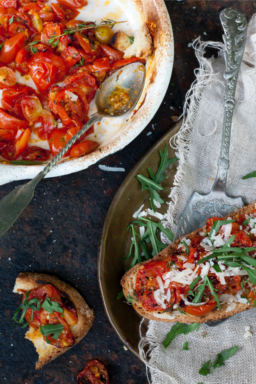 Deze Italiaanse bruschetta met zongedroogde tomaatjes, rucola en Parmezaan is onweerstaanbaar (en simpel!).
