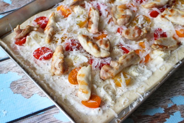 Halveer de cherrytomaatjes en scheur de mozzarella in stukken. Snijd de kip in stukjes en bak in de pan goudbruin, zde stukjes hoeven nog niet gaar te zijn. Verdeel de mozzarella over de pizza en top met de cherrytomaatjes, de Parmezaan en de kip. Bak in 20 tot 25 minuten gaar en goudbruin.