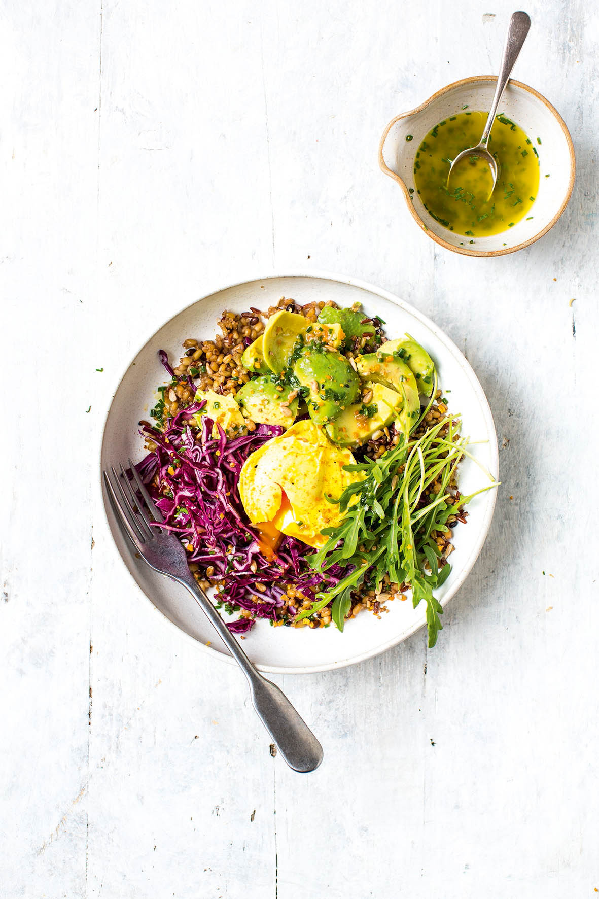 Californische lunchbowl met in kurkuma gepocheerde eieren