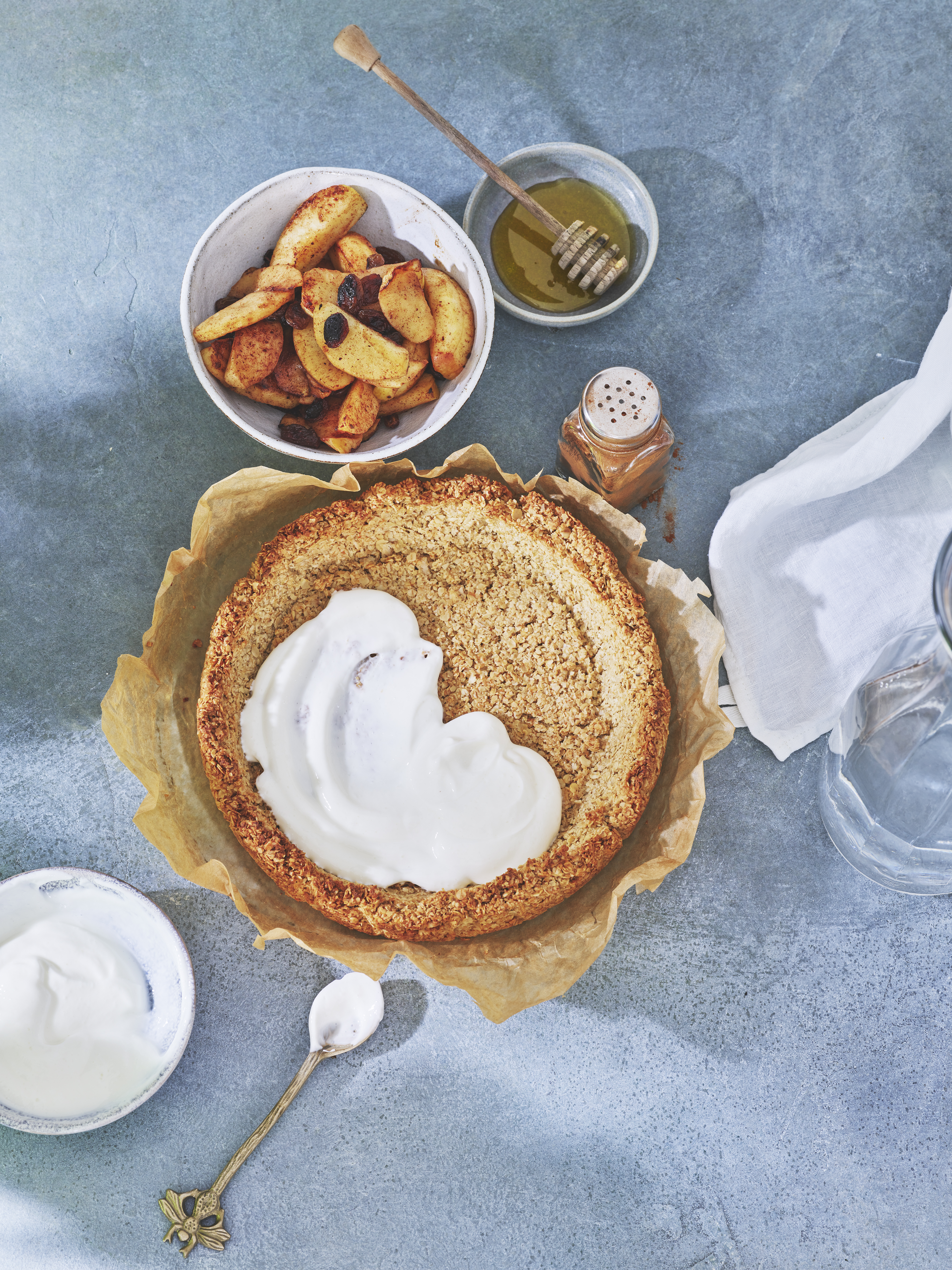 Verwarm de oven voor tot 170 °C en bedek de bodem van een springvorm (wij gebruiken een vorm van 24 centimeter) met bakpapier. Vet de zijkanten in met wat olie. Doe 150 gram van de havervlokken in een keuken-machine en maal fijn tot meel. Smelt de kokosolie in een steelpannetje. Doe het havermeel met de overgebleven haver-vlokken, 4 eetlepels honing en de kokosolie in een kom en kneed met je handen tot een deegbal.