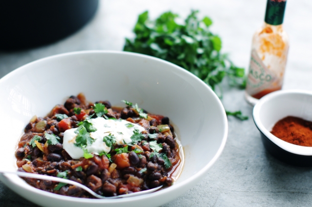 Laat nog een paar minuten staan en verdeel dan de chili over kommen, met de rijst. Schep op elke portie een flinke lepel crème fraîche of Griekse yoghurt, garneer royaal met koriander en eventueel met wat tabasco.