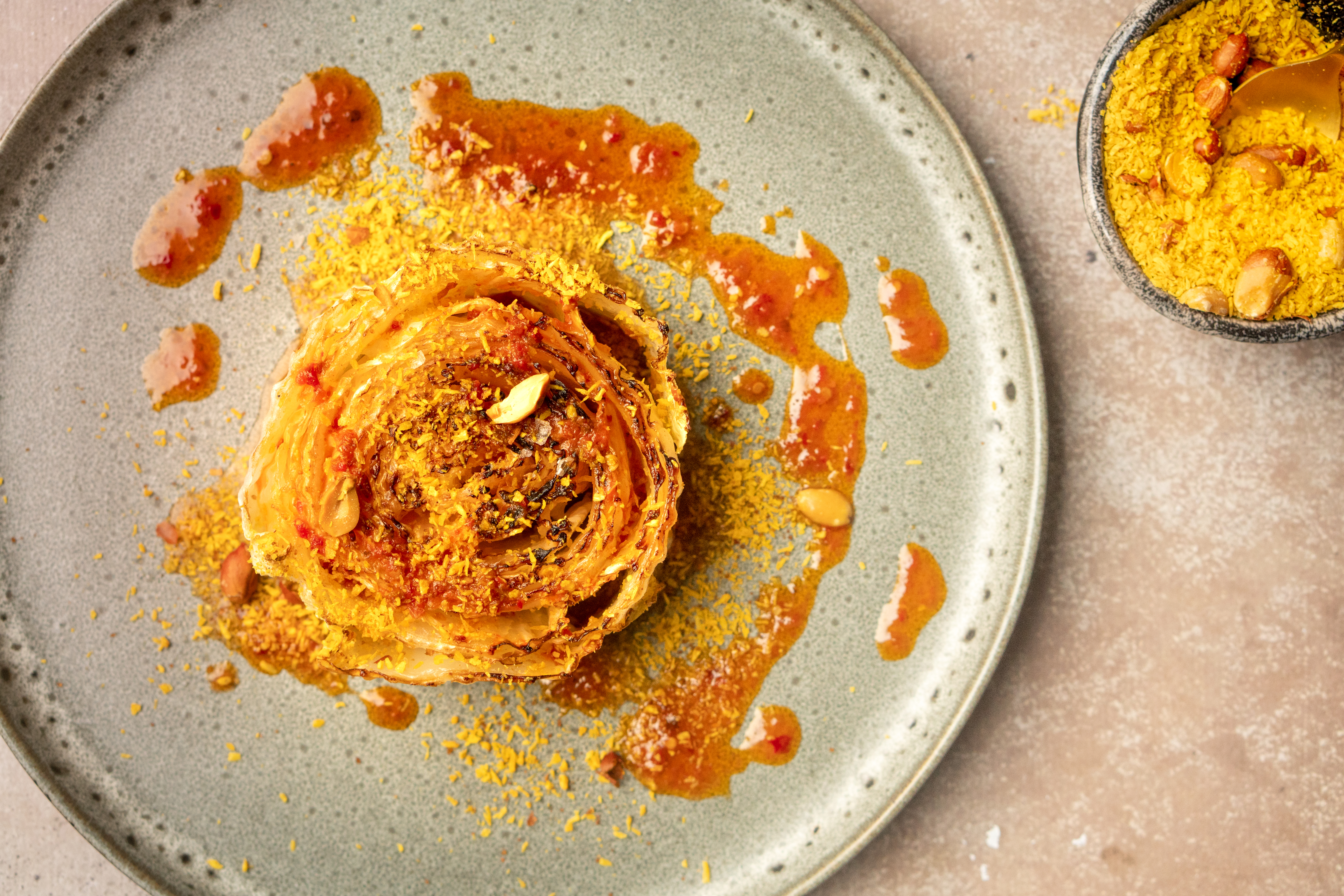 Dit vega(n) gerecht heeft alles: het vlezige van de geschroeide Chinese koolsteaks, pit en zuren van de sambalboter (met een vleugje limoen) en een krokante topping in de vorm van seroendeng.