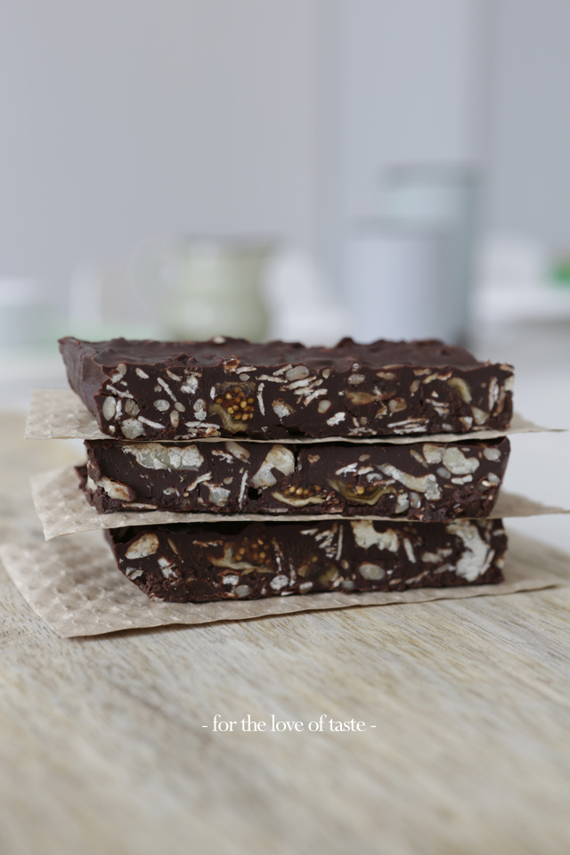 Deze chocolade bars zijn ideaal als luxe snack voor bij de koffie, maar ook leuk als cadeautje. Verpak ze in wit bakpapier, lintje erom en leg ze in een mooi doosje.