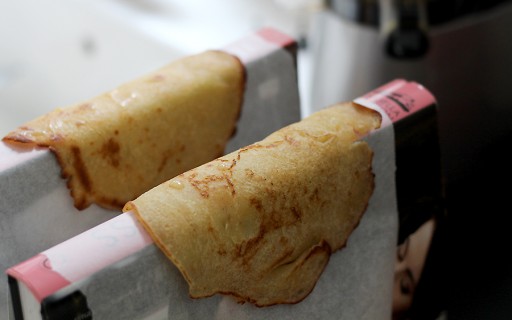 Nu komt de truc: voorzichtig haal je met een grote spatel (of met je handen, als je vuurvaste vingers hebt) de pannenkoek uit de pan en drapeer je deze over het boek heen, zodat er een taco-vorm ontstaat.