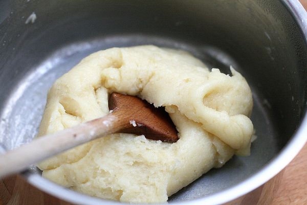 Water, melk, en boter in pannentje verwarmen tot de boter is gesmolten. In een keer de bloem er bij doen en stevig roeren met een pollepel tot er een homogeen deegje is ontstaan. (dat gaart een beetje op het vuur). Haal het pannetje van het vuur en wacht 2 minuten totdat het deeg niet meer zo loeiheet is. Voeg dan een voor een de eieren toe. Het lijkt alsof het schift; dat is dus goed! Na wat spierballen werk wordt ieder ei goed opgenomen!
