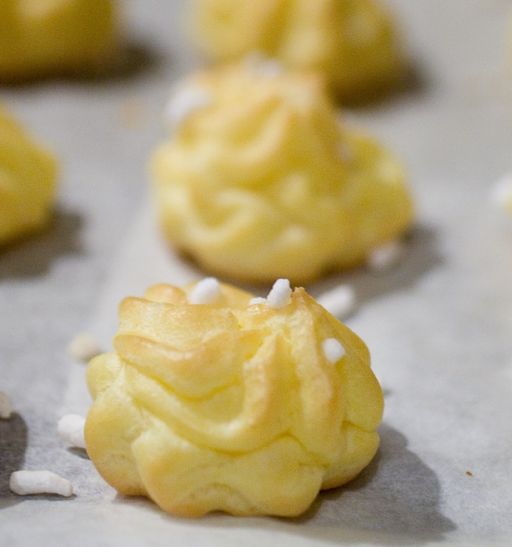 Doe het deeg in een spuitzak en spuit kleine bolletjes (ongeveer het formaat van een grote knikker) op een met bakpapier beklede bakplaat. Geen spuitzak? Een beetje prutsen met twee theelepeltjes werkt ook prima, het hoeft niet zo precies! Ze rijzen nog wel in de oven dus geef ze de ruimte.