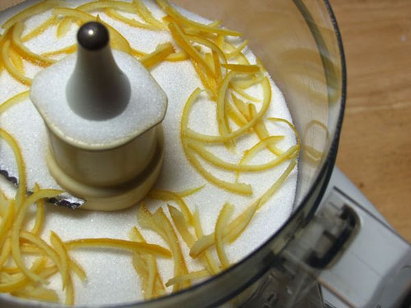 Schil de citroenen met een mesje of dunschiller. Schraap zo veel mogelijk van het witte bittere merg van de schil af. Hak de citroenschillen in kleinere stukken en voeg de stukjes schil samen met 250 gram suiker in een keukenmachine. Vermaal de schillen samen met de suiker voor ongeveer 3 minuten in de keukenmachine.