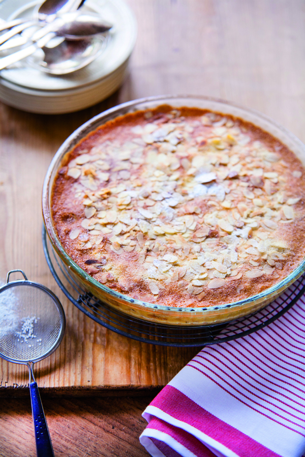 De clafoutis is warm het lekkerst. Zet de clafoutis daarom voordat je het hoofdgerecht serveert in de oven, dan is de taart mooi op temperatuur als het tijd is voor het dessert. Bestrooi de clafoutis voor het serveren met poedersuiker en amandelschaafsel.