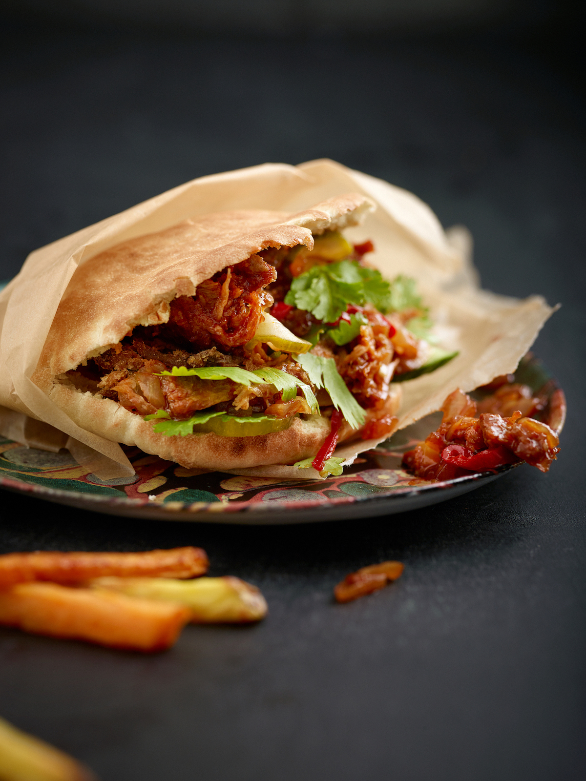 Colaburger met Pulled Oats en zoete aardappelfrietjes