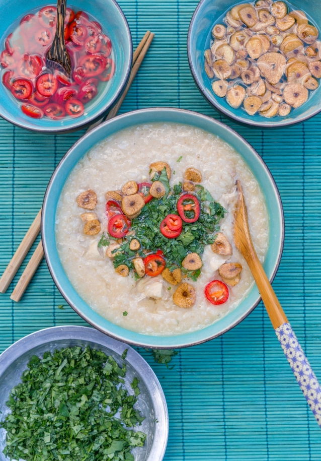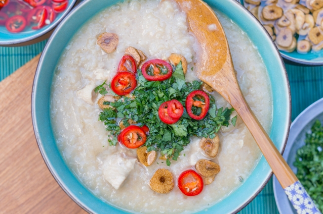 Congee is een Chinese rijstepap, die vaak ook hartig wordt geserveerd. Deze variant met véél gember, kip, knapperige schijfjes knoflook, rode peper en koriander gaat je favoriet worden.