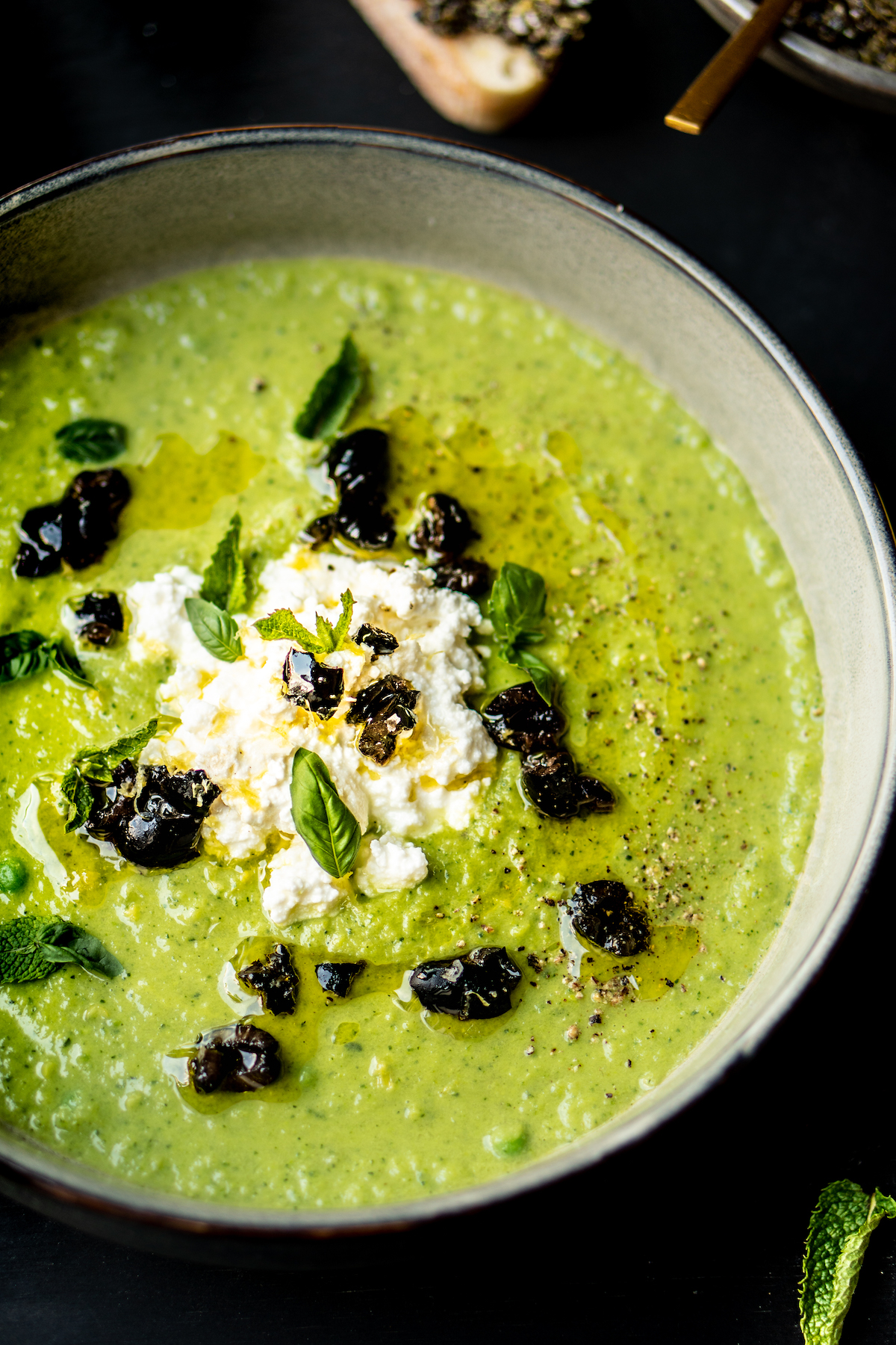 Courgettesoep met doperwten, ricotta & zwarte olijf
