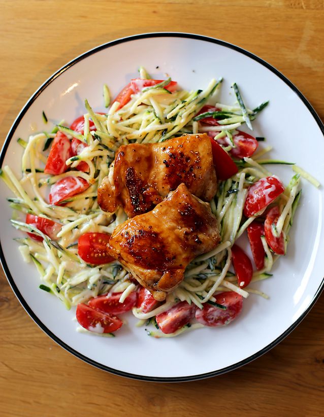 Snijd de romaatjes in kwarten en maak de courgetti aan met de dressing. Serveer alles met de krokante kip.