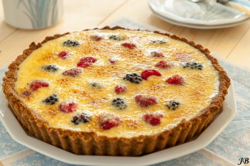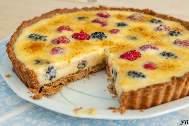 Crème brûlée-taart met bosvruchten en witte chocolade