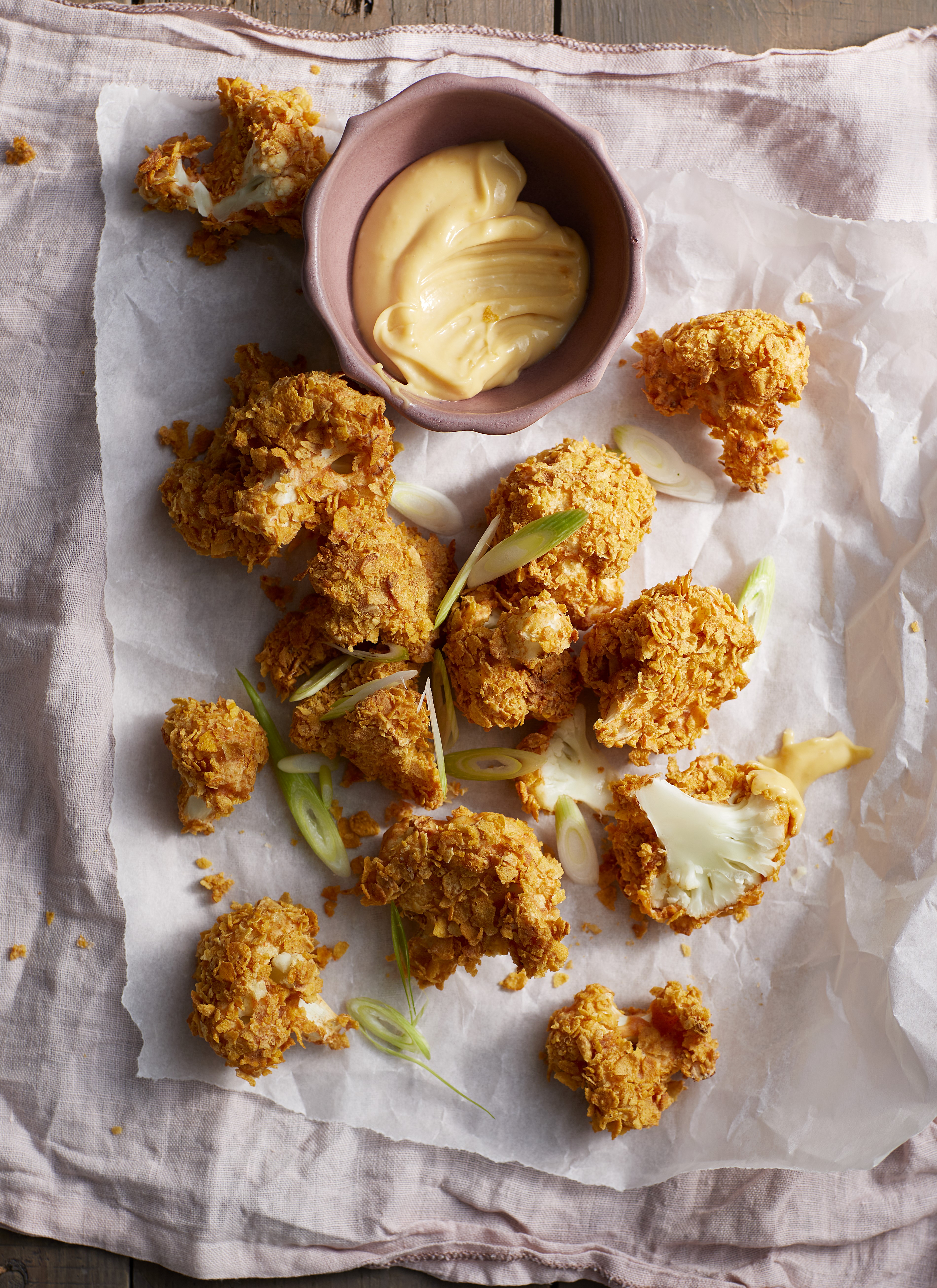 4. Haal de gecoate bloemroosjes door de cornflakes en leg ze in het mandje van de airfryer. Doe dat zoveel mogelijk in een enkele laag. Bak ze 15 tot 20 minuten op 180 °C tot de buitenkant krokant is en de groente gaar.