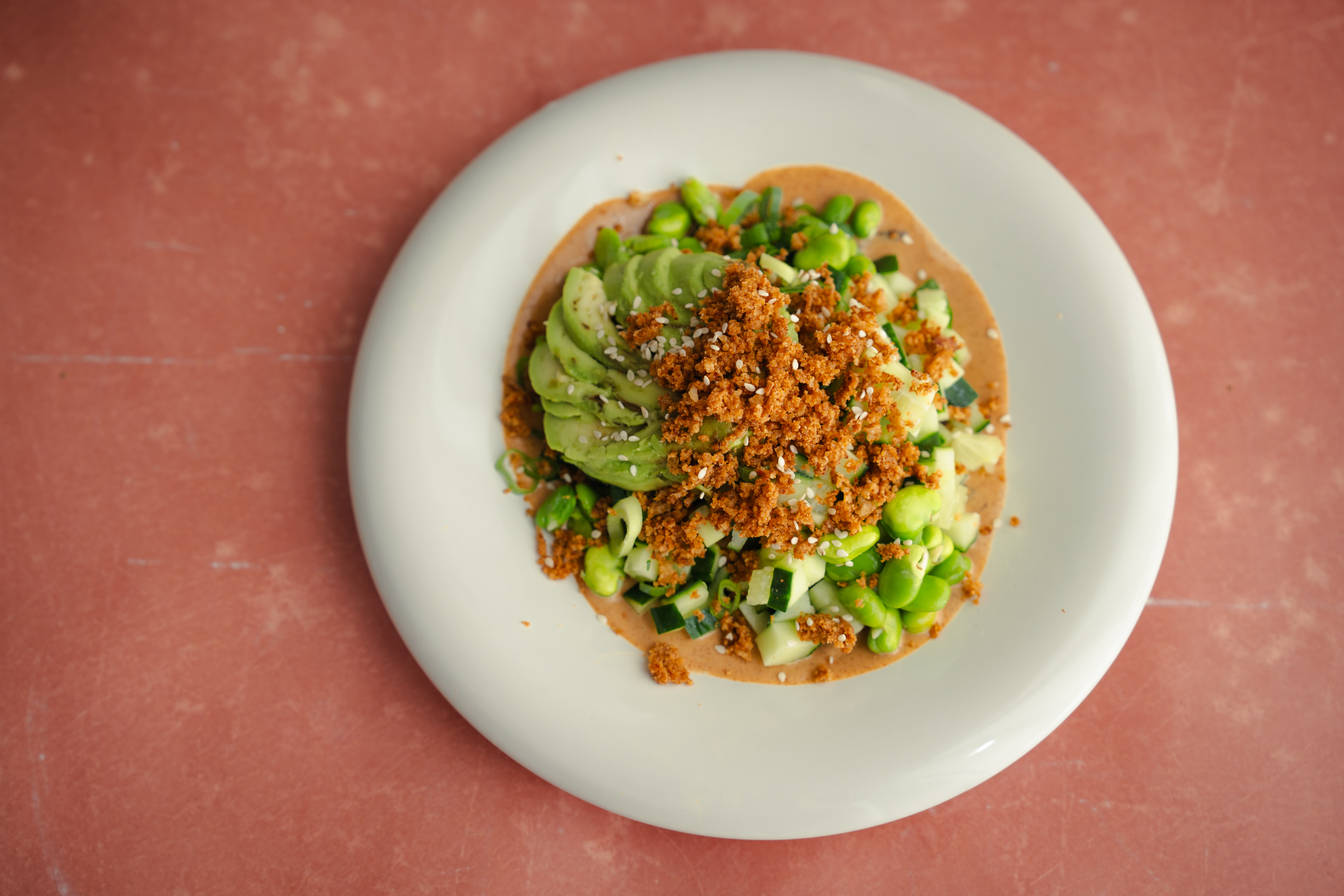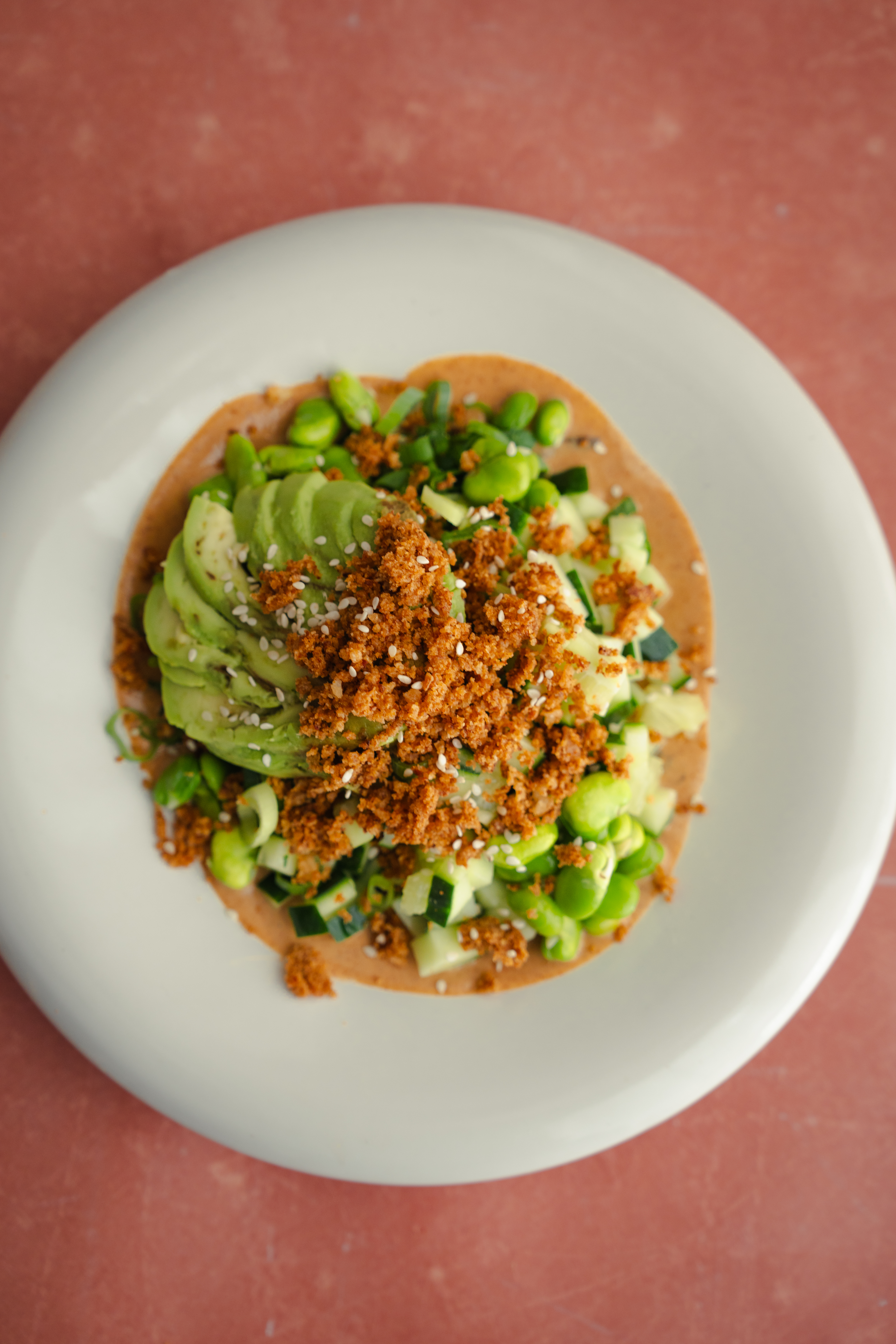 - Verdeel over twee kommen de edamame, komkommer, lente–ui, avocado, verse munt, de gebakken paddenstoelen en de krokante rijst.