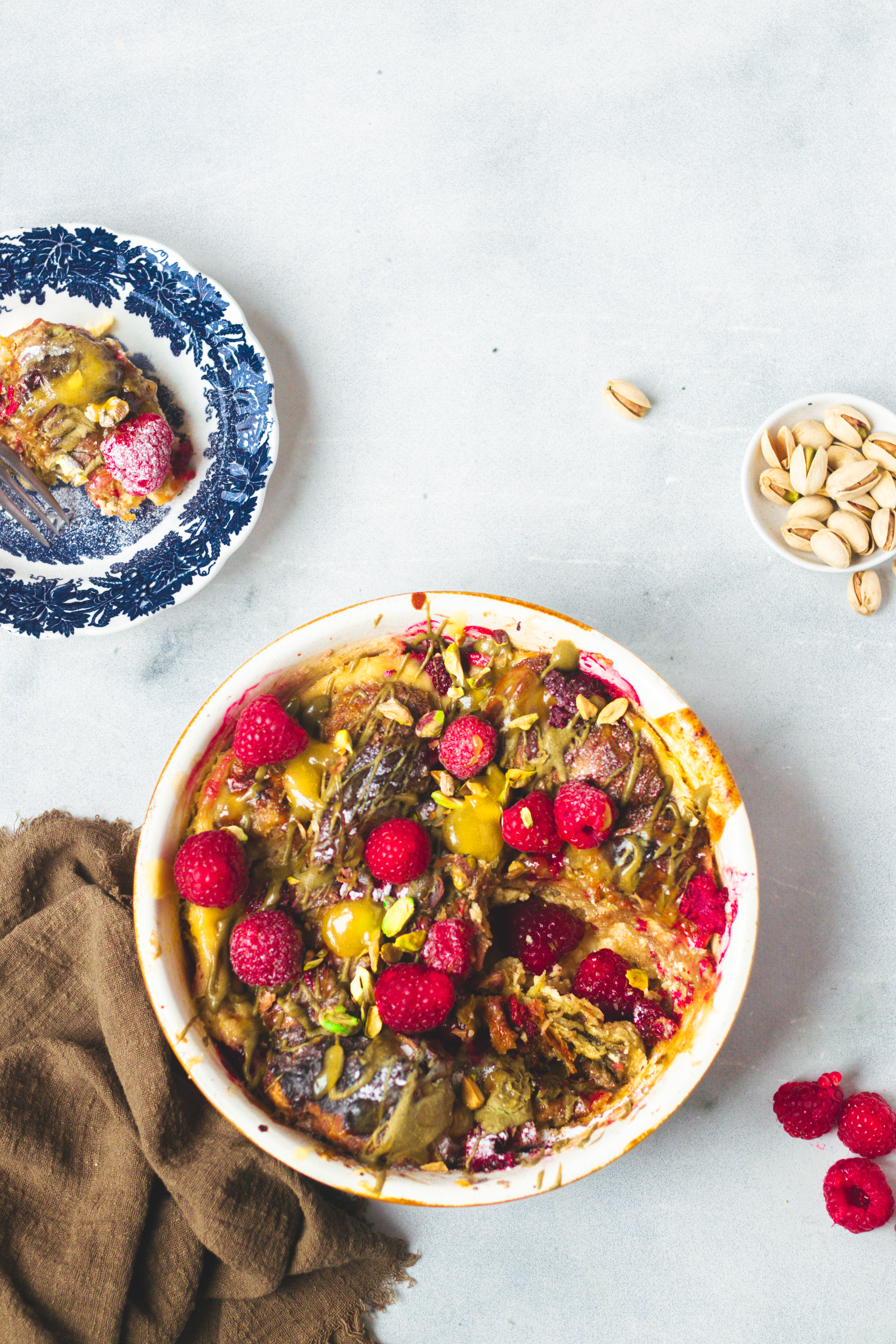 - Maak de croissant broodpudding af met gehakte pistachenoten, de overgebleven frambozen en poedersuiker.