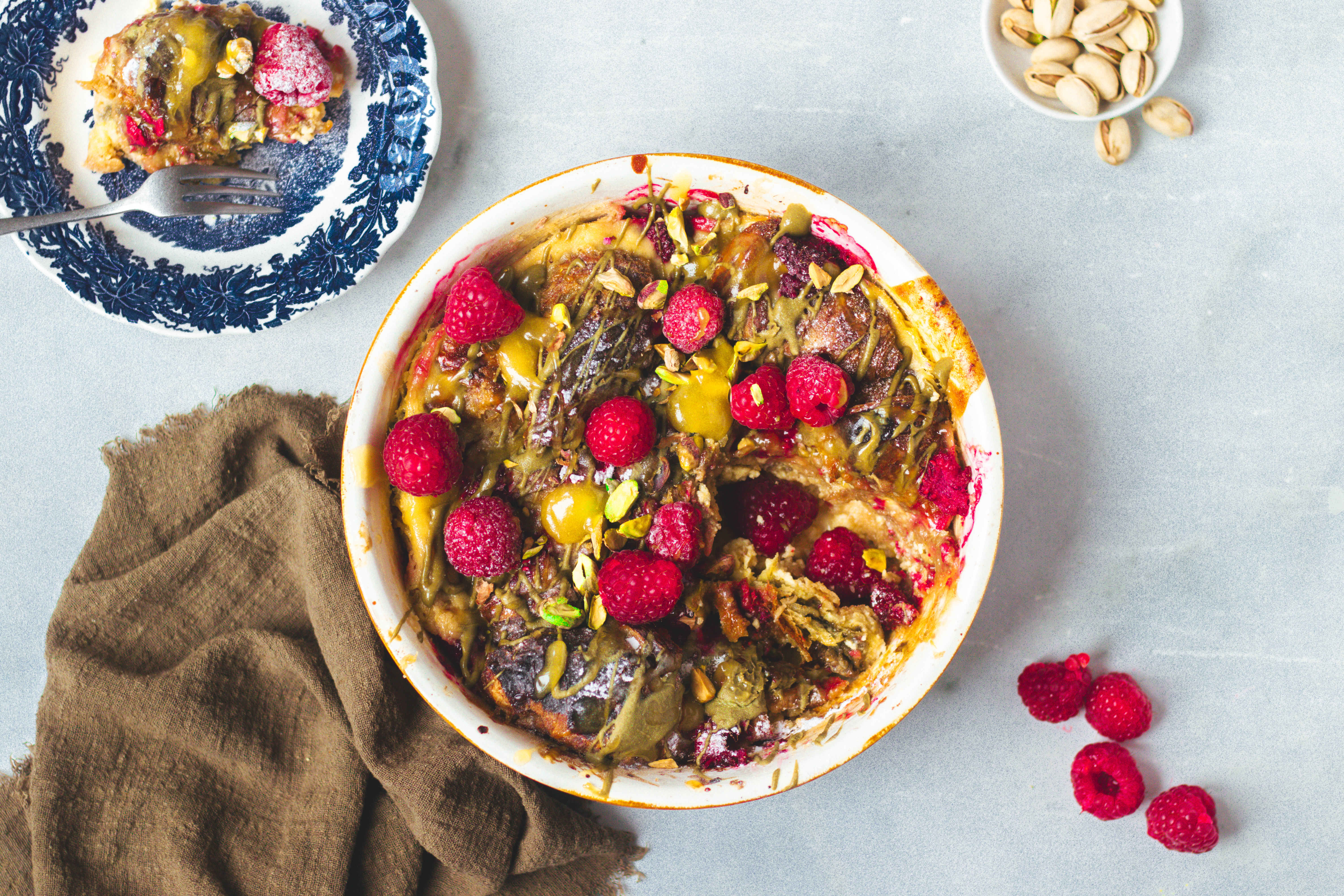 Croissant broodpudding met lemon curd en pistache voor de paasbrunch
