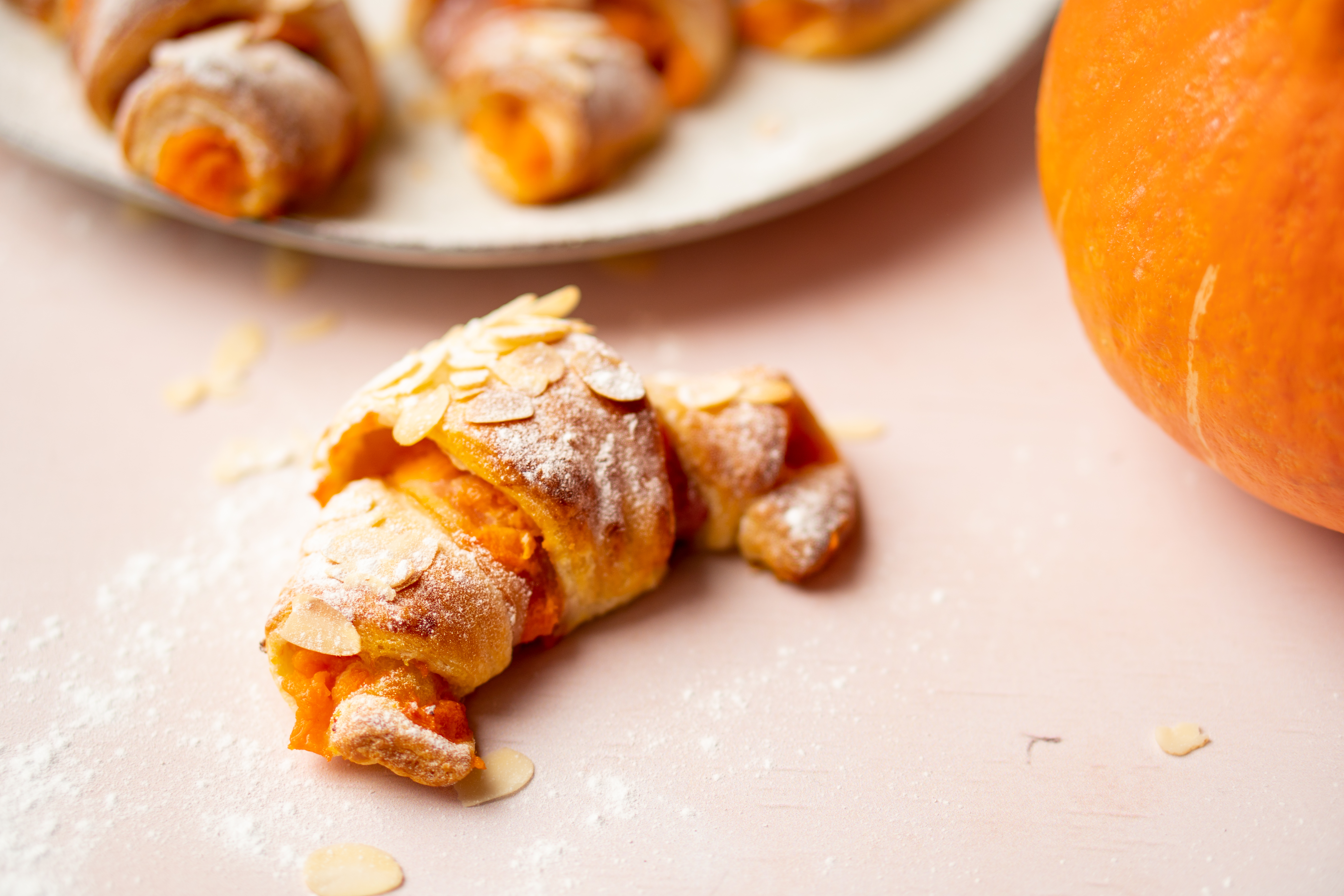 Lekker voor je herfstontbijt, deze croissants met pompoen. Met een beetje pompoenpuree maak je er écht wat bijzonders van. Lekker met hartig spek en een beetje zoete poedersuiker en amandelen eroverheen.