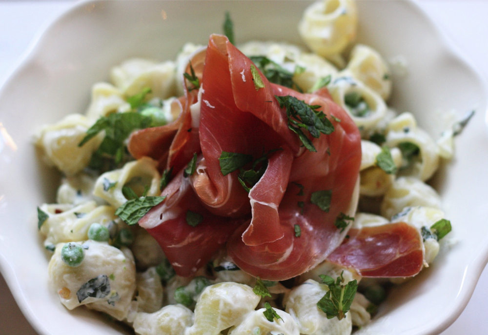 Kook de pasta. Giet de pasta af en laat het goed uitlekken. Voeg de pasta aan de saus toe. Hak de munt (bewaar een beetje voor het aftoppen) en voeg die samen met de erwtjes toe aan de pasta. Schep alles goed om. Verdeel de pasta over 2 kommen en verdeel de ham over de pasta. Maak het geheel af met een beetje verse munt en gemalen peper.