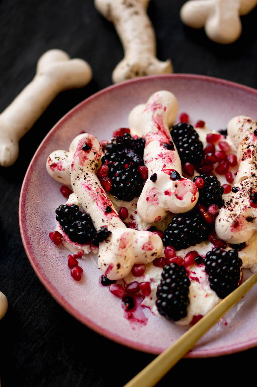 Schep de room op een bordje, verdeel de bloederige botjes van meringue erover en strooi het fruit over het bord. Knijp het kapot voor een extra bloederig effect. Dig in… als je durft.