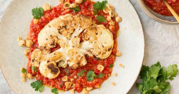 Een superlekkere vegan maaltijd voor doordeweeks: bloemkoolsteak met romescosaus en hazelnoten. Daarvan gaat de zon spontaan schijnen.
