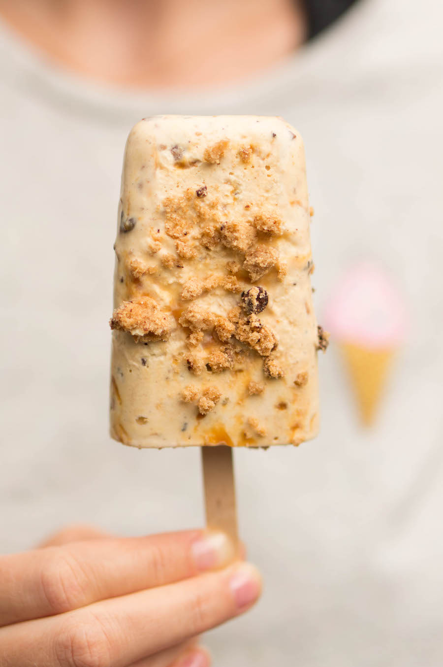 Strooi een klein beetje koekkruimels bovenop de ijsjes en plaats de stokjes in de ijsjes. Zet de ijsvorm in de vriezer en laat de chocolate chip cookie-ijsjes daarin minstens 3 uur opstijven.