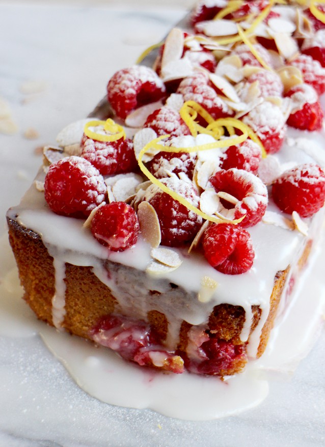 Laat de cake nog zeker een half uur afkoelen in de vorm (zo lang hij warm is, breekt hij vrij snel). Garneer de cake met het glazuur, de frambozen, de citroenrasp en het amandelschaafsel.